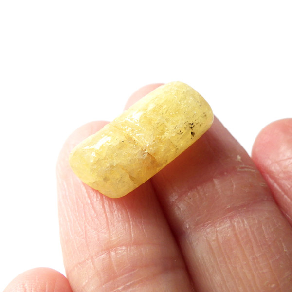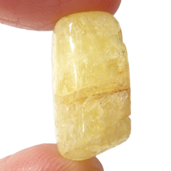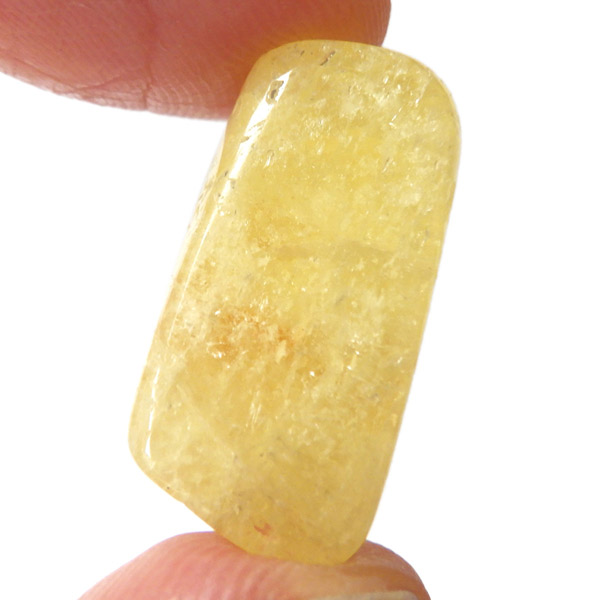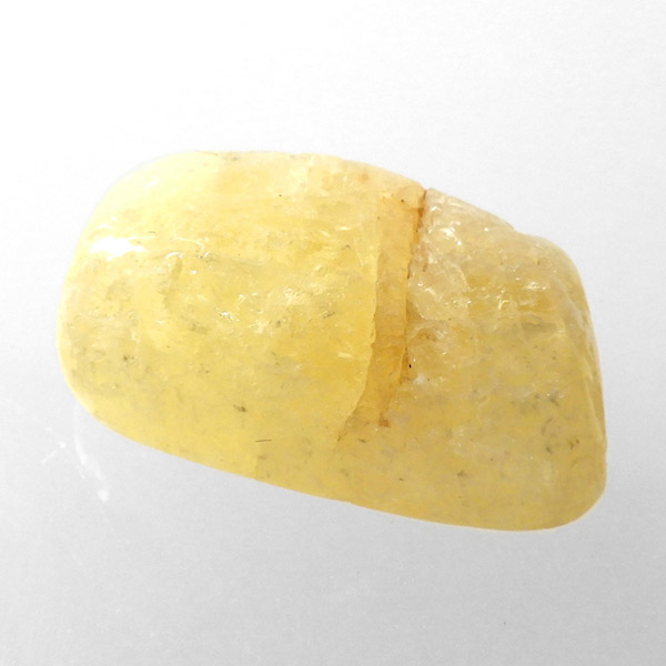 タンザニア産のゴールデンダンビュライト、タンブルです。ダンビュライトと言えば、透明度の高い結晶や、薄いピンク色の結晶がよく知られています。 光の反射が強く、屈折率が高いことから、良質な原石をカットすると水晶やトパーズよりも透明で澄んでいて、かつてダイアモンドの代用品として利用されていたこともあります。ところが、タンザニア産のダンビュライトは 明るいイエローの発色で、塊状で産するのが特徴です。