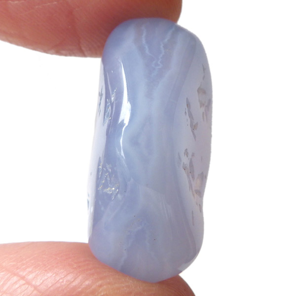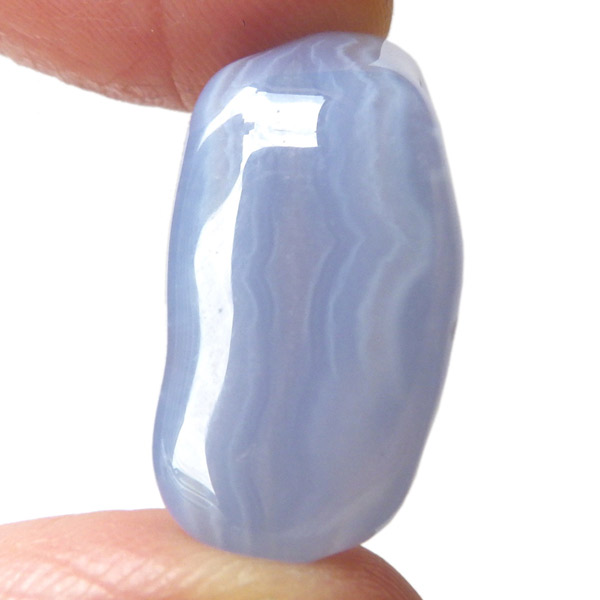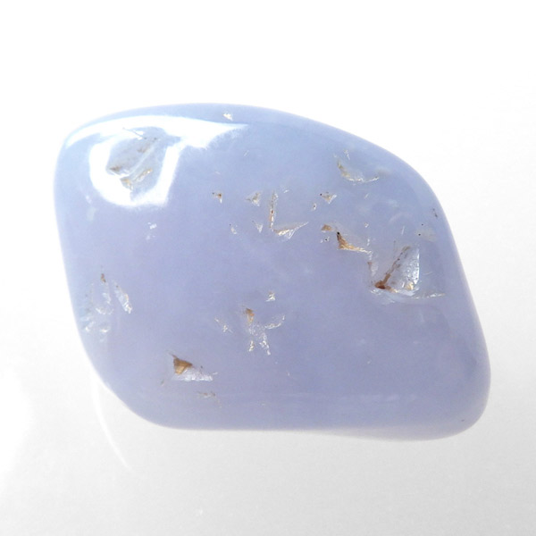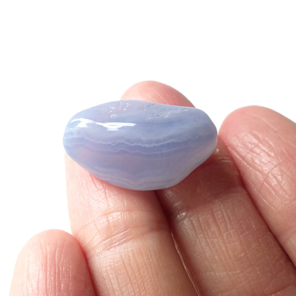 トルコ産のブルーカルセドニー、タンブルです。カルセドニーはアゲートとよく似ており、いろいろな色が混ざっており、模様があるものがアゲート、色が均一で模様がないものがカルセドニー分類されています。カルセドニーのグループにはカーネリアンやクリソプレーズなど鮮やかな石があるのは有名です。こちらのブルーカルセドニーは落ち着いたブルーの天然の発色で、光に透かした透過光は赤みを帯びたミルキーな色味があります。カルセドニーの産地でも白っぽいライトなブルーカルセドニーなども多く、ブルーカルセドニーの中でも発色が良く、高品質なタンブルです。