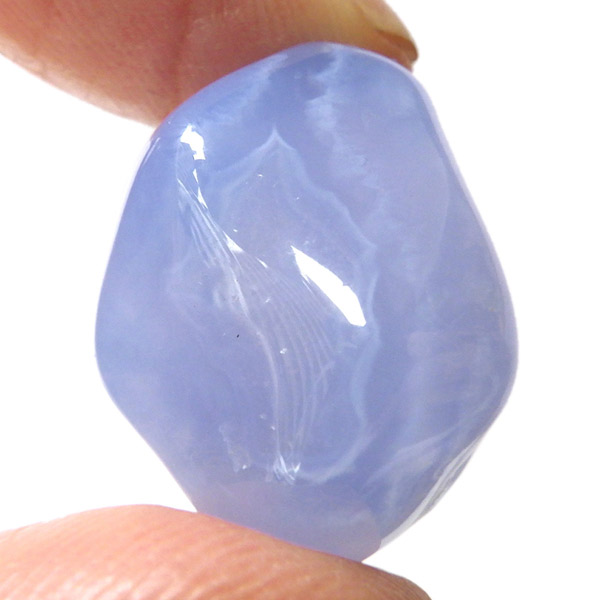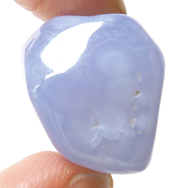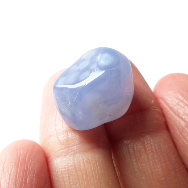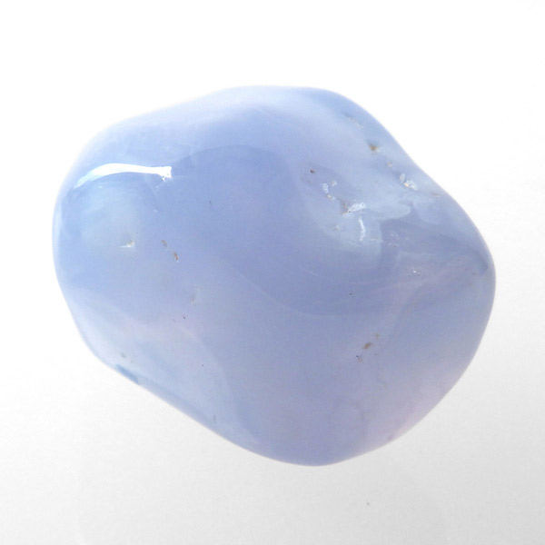 トルコ産のブルーカルセドニー、タンブルです。カルセドニーはアゲートとよく似ており、いろいろな色が混ざっており、模様があるものがアゲート、色が均一で模様がないものがカルセドニー分類されています。カルセドニーのグループにはカーネリアンやクリソプレーズなど鮮やかな石があるのは有名です。こちらのブルーカルセドニーは落ち着いたブルーの天然の発色で、光に透かした透過光は赤みを帯びたミルキーな色味があります。カルセドニーの産地でも白っぽいライトなブルーカルセドニーなども多く、ブルーカルセドニーの中でも発色が良く、高品質なタンブルです。