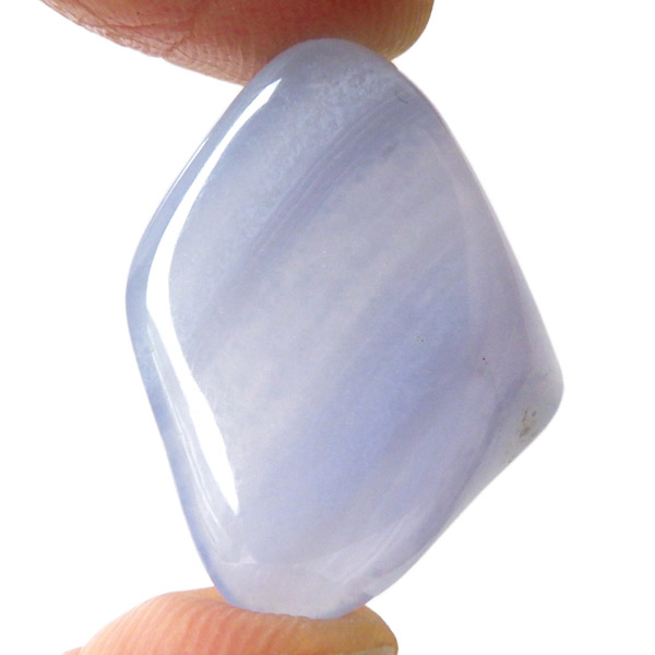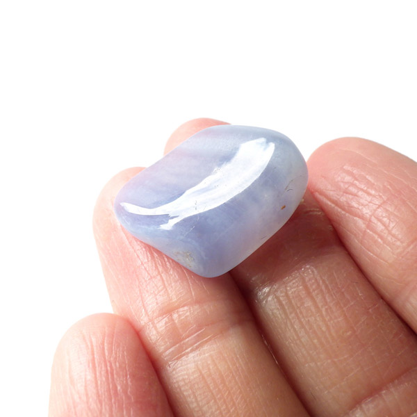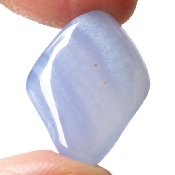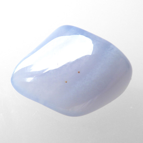 トルコ産のブルーカルセドニー、タンブルです。カルセドニーはアゲートとよく似ており、いろいろな色が混ざっており、模様があるものがアゲート、色が均一で模様がないものがカルセドニー分類されています。カルセドニーのグループにはカーネリアンやクリソプレーズなど鮮やかな石があるのは有名です。こちらのブルーカルセドニーは落ち着いたブルーの天然の発色で、光に透かした透過光は赤みを帯びたミルキーな色味があります。カルセドニーの産地でも白っぽいライトなブルーカルセドニーなども多く、ブルーカルセドニーの中でも発色が良く、高品質なタンブルです。