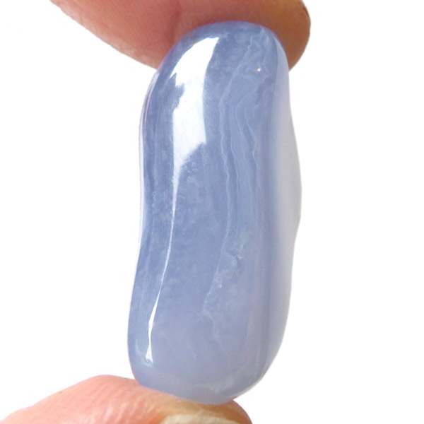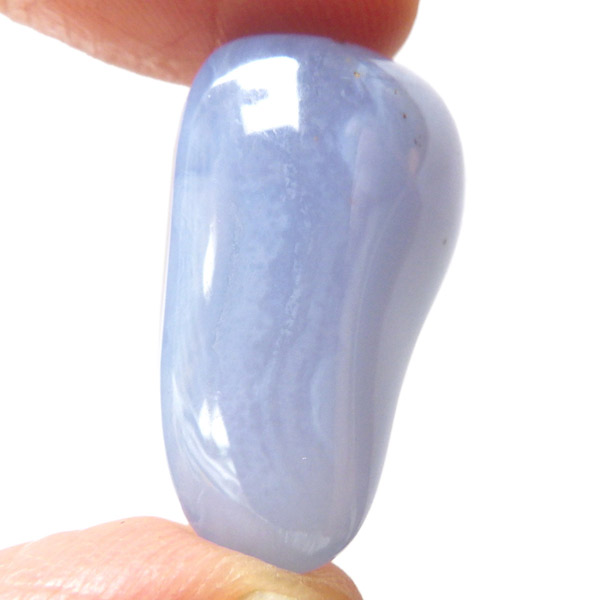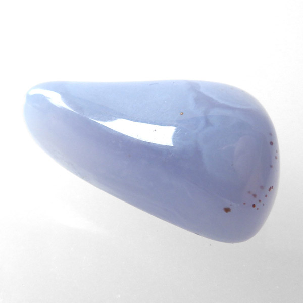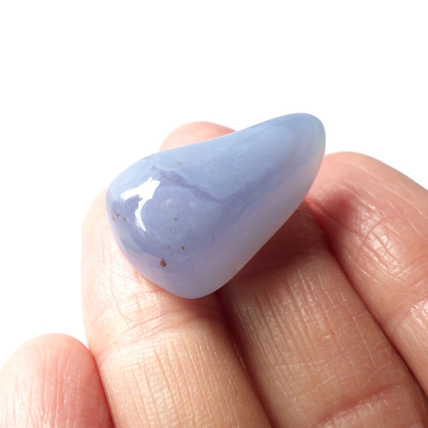トルコ産のブルーカルセドニー、タンブルです。カルセドニーはアゲートとよく似ており、いろいろな色が混ざっており、模様があるものがアゲート、色が均一で模様がないものがカルセドニー分類されています。カルセドニーのグループにはカーネリアンやクリソプレーズなど鮮やかな石があるのは有名です。こちらのブルーカルセドニーは落ち着いたブルーの天然の発色で、光に透かした透過光は赤みを帯びたミルキーな色味があります。カルセドニーの産地でも白っぽいライトなブルーカルセドニーなども多く、ブルーカルセドニーの中でも発色が良く、高品質なタンブルです。