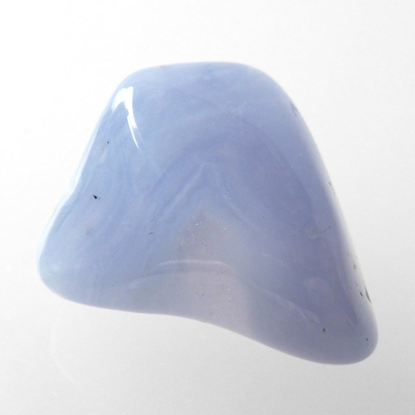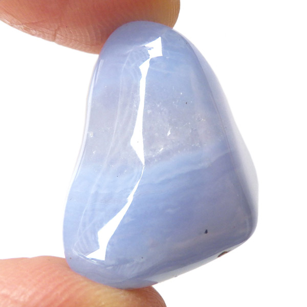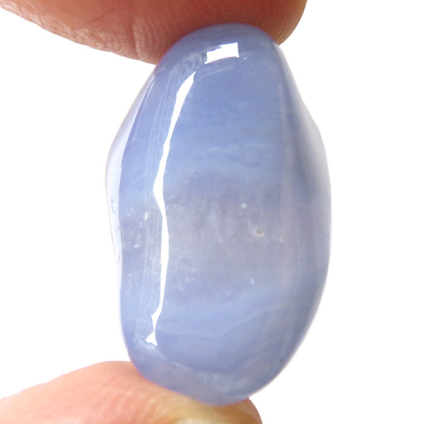トルコ産のブルーカルセドニー、タンブルです。カルセドニーはアゲートとよく似ており、いろいろな色が混ざっており、模様があるものがアゲート、色が均一で模様がないものがカルセドニー分類されています。カルセドニーのグループにはカーネリアンやクリソプレーズなど鮮やかな石があるのは有名です。こちらのブルーカルセドニーは落ち着いたブルーの天然の発色で、光に透かした透過光は赤みを帯びたミルキーな色味があります。カルセドニーの産地でも白っぽいライトなブルーカルセドニーなども多く、ブルーカルセドニーの中でも発色が良く、高品質なタンブルです。