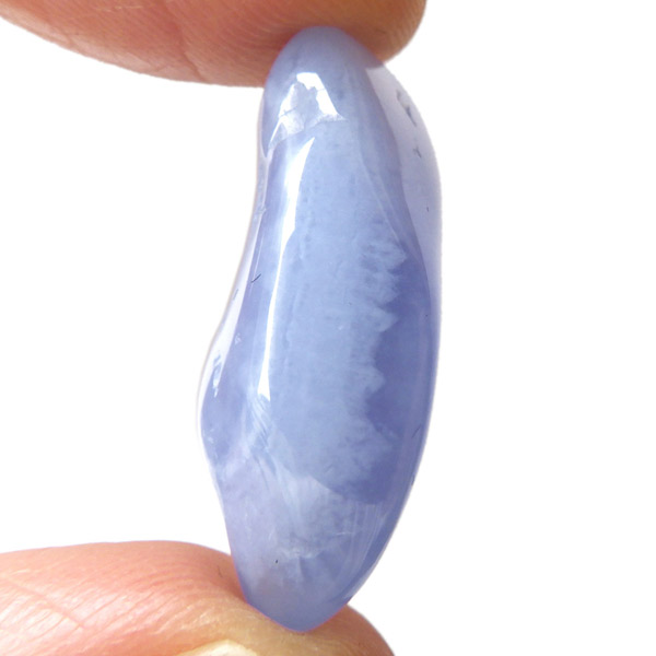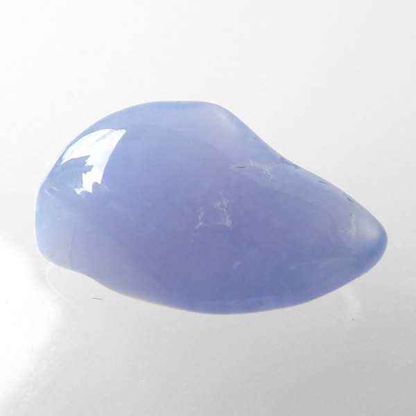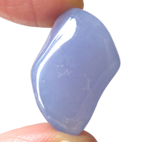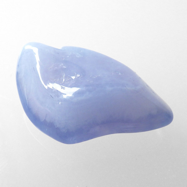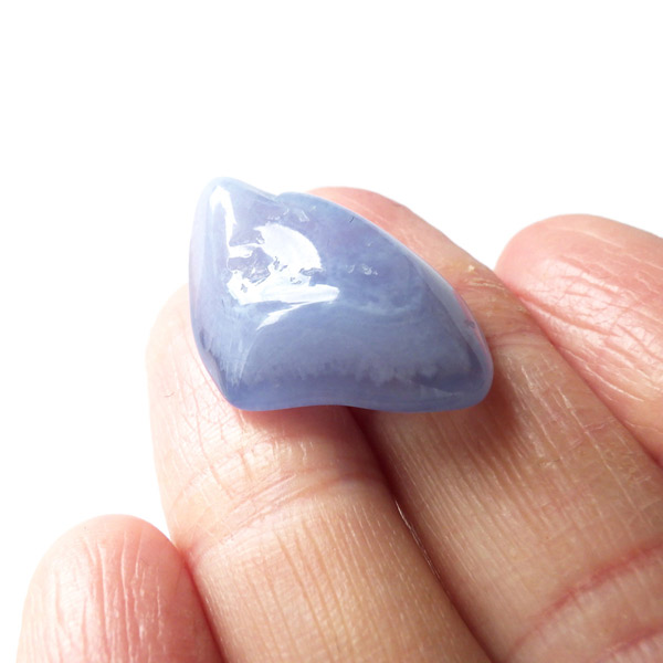トルコ産のブルーカルセドニー、タンブルです。カルセドニーはアゲートとよく似ており、いろいろな色が混ざっており、模様があるものがアゲート、色が均一で模様がないものがカルセドニー分類されています。カルセドニーのグループにはカーネリアンやクリソプレーズなど鮮やかな石があるのは有名です。こちらのブルーカルセドニーは落ち着いたブルーの天然の発色で、光に透かした透過光は赤みを帯びたミルキーな色味があります。カルセドニーの産地でも白っぽいライトなブルーカルセドニーなども多く、ブルーカルセドニーの中でも発色が良く、高品質なタンブルです。