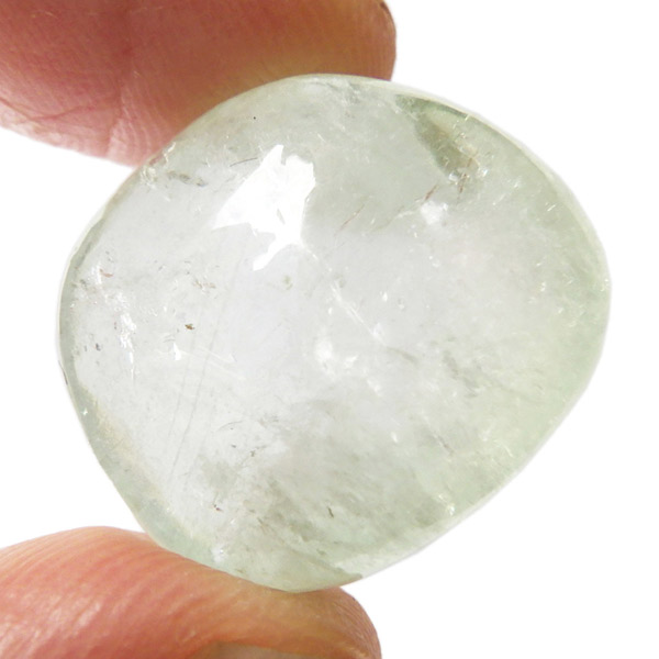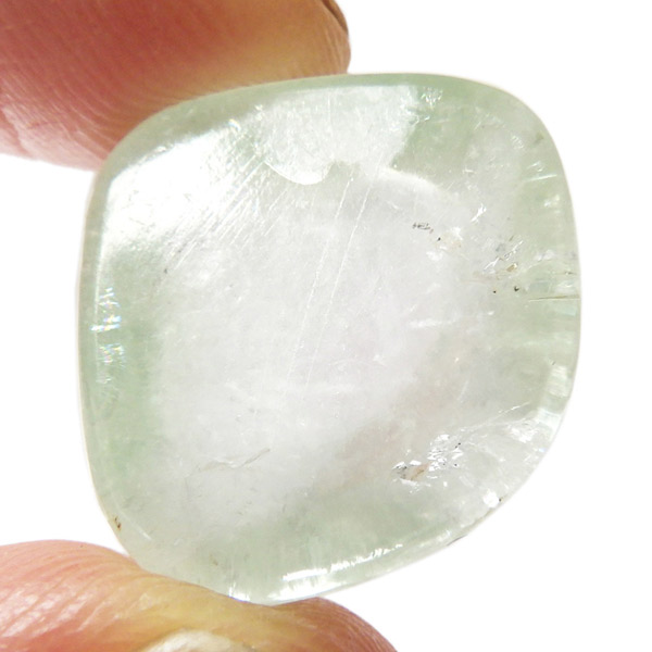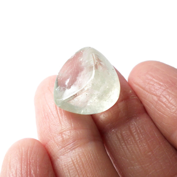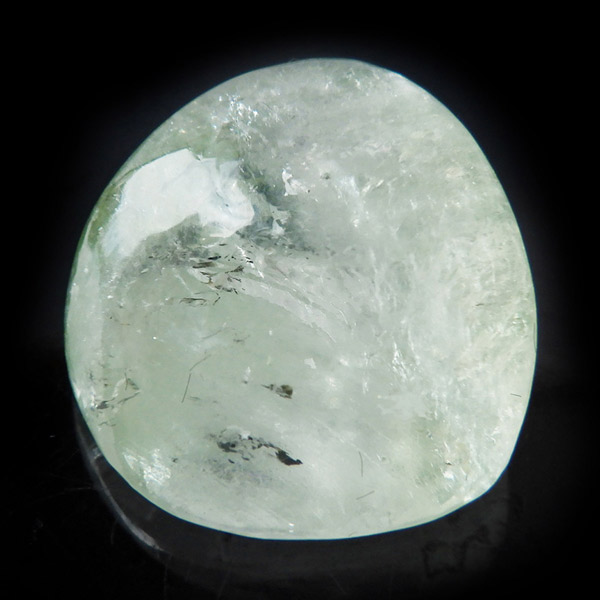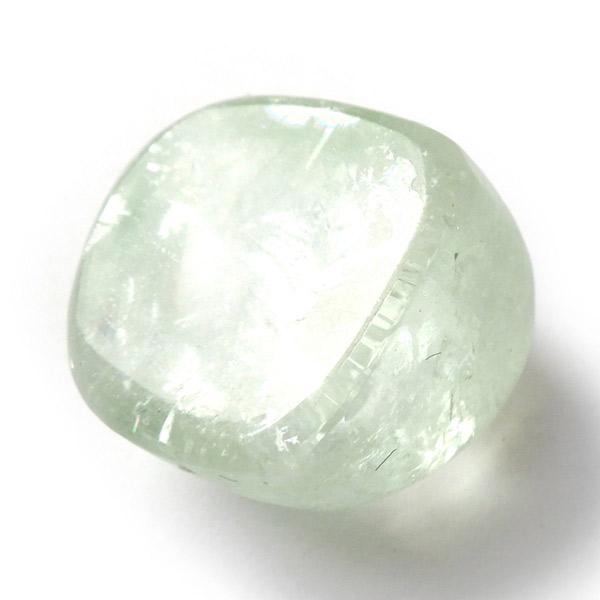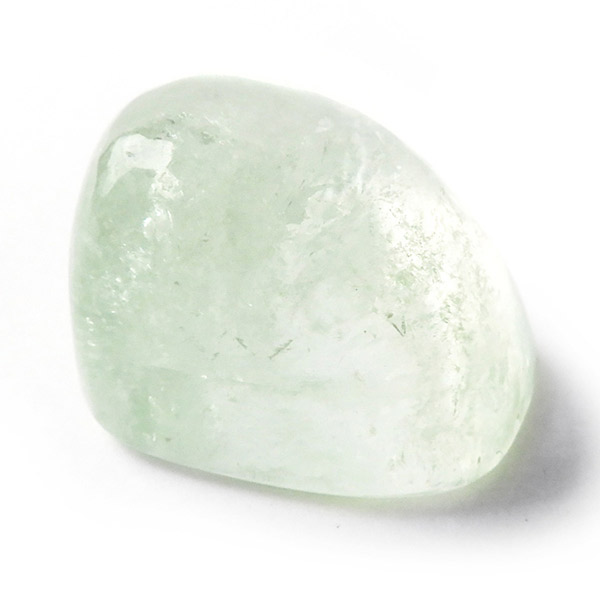 インド、プネー産のグリーンアポフィライト、タンブルです。アポフィライトは、柱状や正方錘状の結晶を持ち、ひとつひとつの結晶が複雑に入り組んだ群晶が水晶とは違う神々しい輝きを魅せてくれます。和名で魚眼石といわれる通りのギラっとした劈開面の輝きがなんとも美しいです。色合いは優しいグリーンで、透明感もあり、レインボーもキラキラと輝き、とても魅力的なタンブルです。