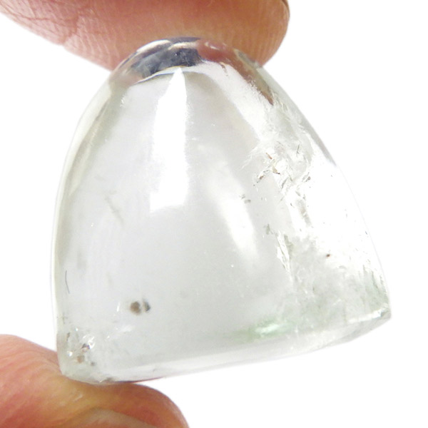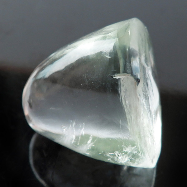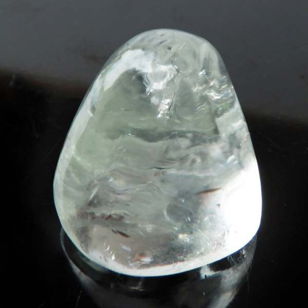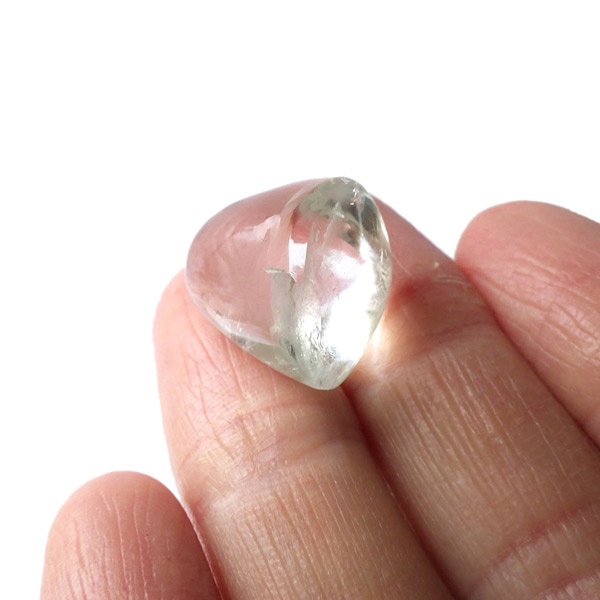 インド、プネー産のグリーンアポフィライト、タンブルです。アポフィライトは、柱状や正方錘状の結晶を持ち、ひとつひとつの結晶が複雑に入り組んだ群晶が水晶とは違う神々しい輝きを魅せてくれます。和名で魚眼石といわれる通りのギラっとした劈開面の輝きがなんとも美しいです。色合いは優しいグリーンで、透明感もあり、レインボーもキラキラと輝き、とても魅力的なタンブルです。