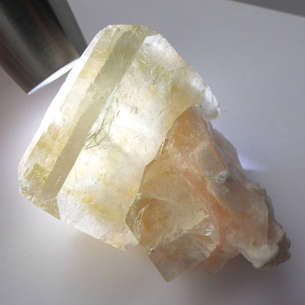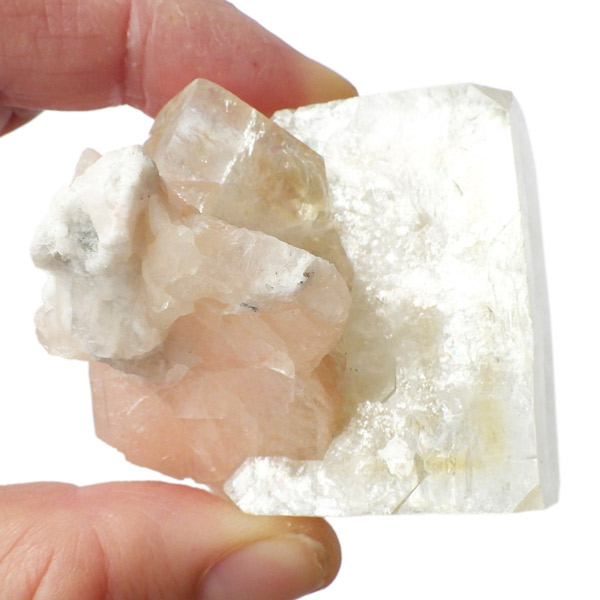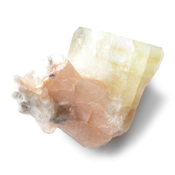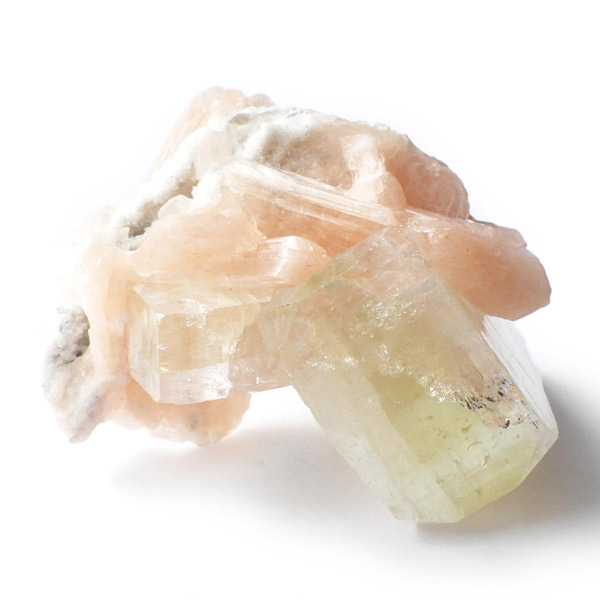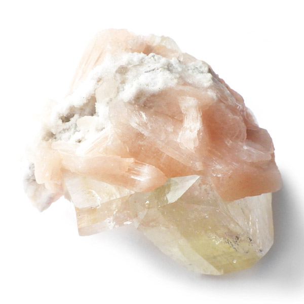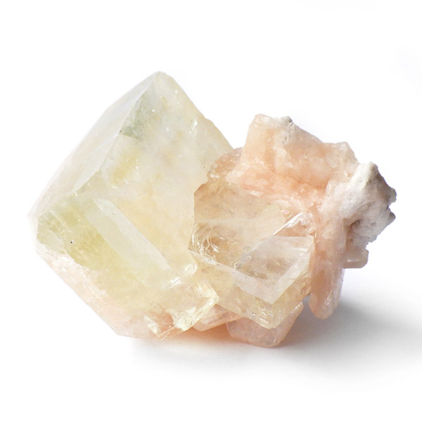 インド産のグリーンアポフィライト原石です。2つのガラス質のブロック状のアポフィライト結晶を中心とした標本です。カラーはイエローグリーン。淡いオレンジのスティルバイトも共生しており、魅力的なアクセントになっています。アポフィライトならではのギラギラの劈開面も美しく、どの角度から見てもバランスのとれた見事なアポフィライトです。