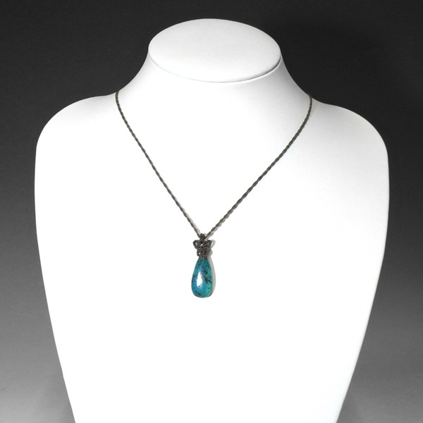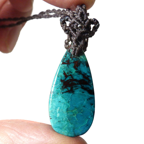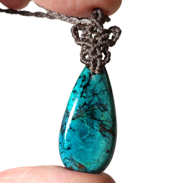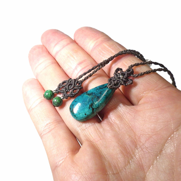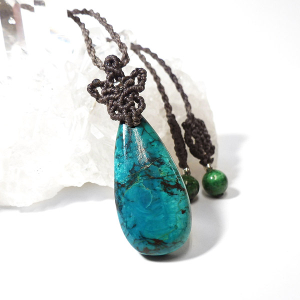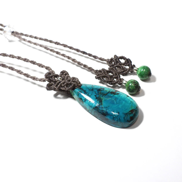ペルー産のクリソコラを使用したマクラメペンダントです。 深いブルーグリーンのクリソコラを使用しました。気軽に身に着けやすい、すっきりとしたデザインにしました。