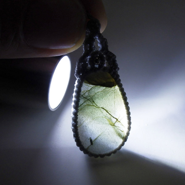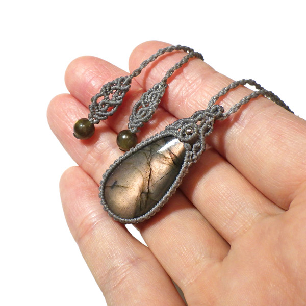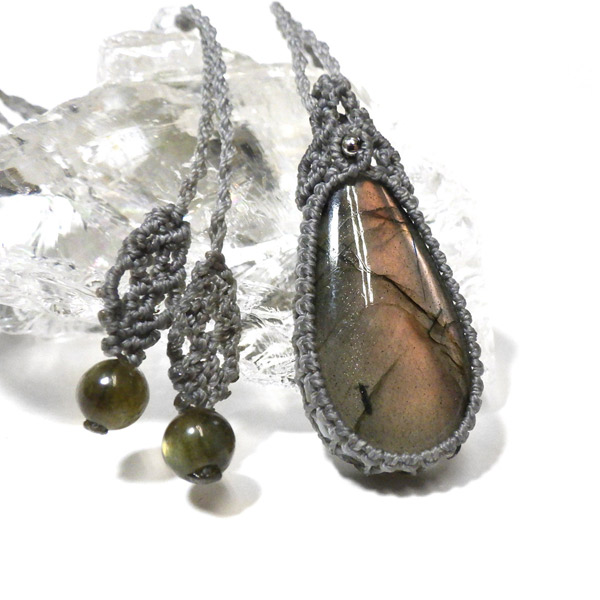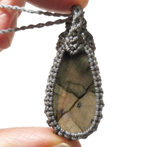 マダガスカル産のピンクラブラドライトを使用したマクラメペンダントです。 半透明で全面輝くピンクラブラドライトを使用しました。紐はピンクの輝きが良く分かるようにグレーを選びました。エンド部分のラブラドライトは黄色、緑、オレンジに輝きます。
