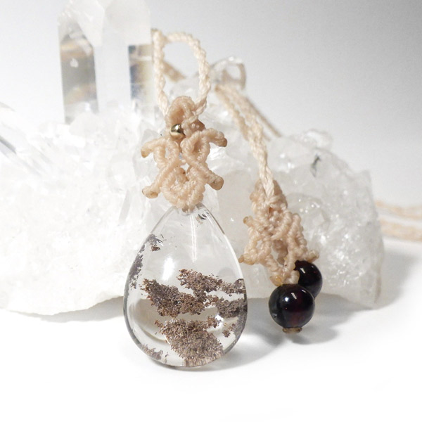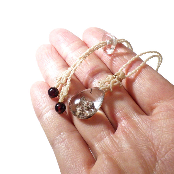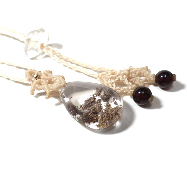 ブラジル産のガーデンクォーツを使用したマクラメペンダントです。 透明度の高いガーデンクォーツを使用しました。気軽に身に着けやすい、すっきりとしたデザインにし、紐は石が主役に立つように優しいベージュを選びました。エンド部分のビーズは色がかわいいガーネットにしました。