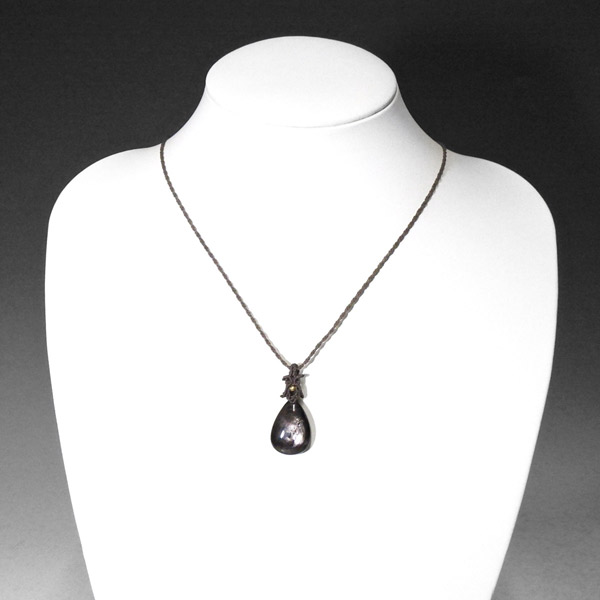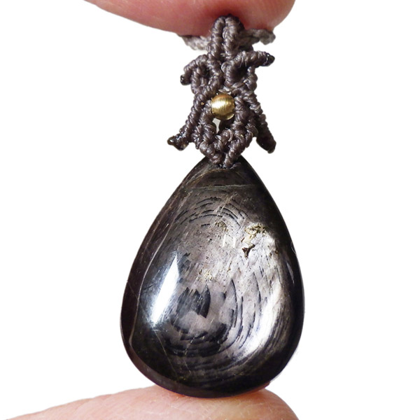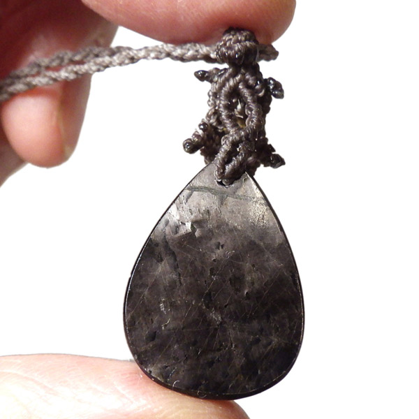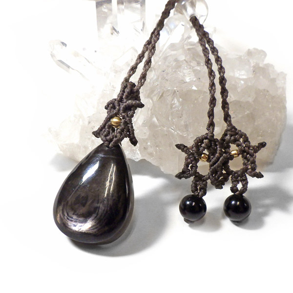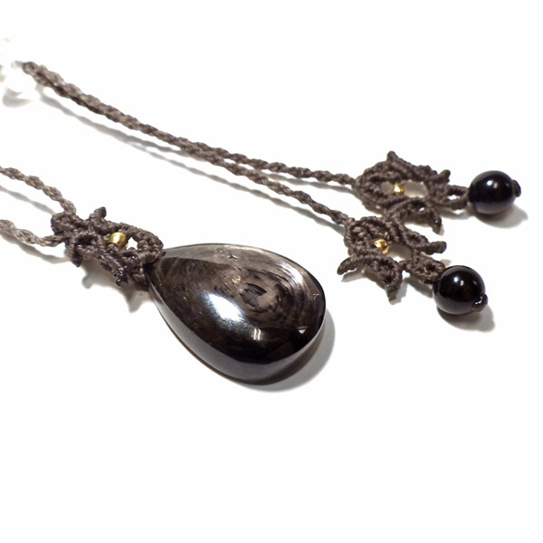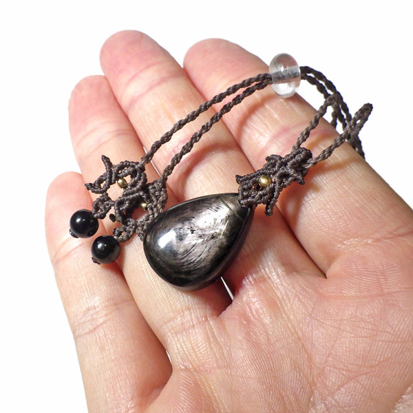 カナダ産のハイパーシーンを使用したマクラメペンダントです。 全面輝くきれいなハイパーシーンを使用しました。一見すると黒い石ですが、角度を変えると白銀色のシラーが現れます。ハイパーシーンの特徴的な白銀色の輝きが胸元でギラリと輝きます。エンド部分のビーズにはオニキスを使っています。