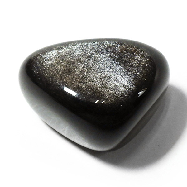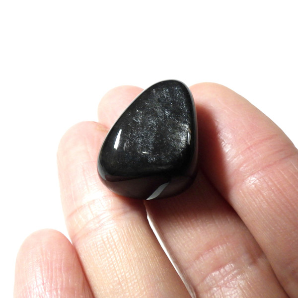 メキシコ産のシルバーオブシディアン、タンブルです。オブシディアンは和名で黒曜石。シルバーオブシディアンは黒曜石の中でもシルバーのシラー光沢を確認できる天然の火山ガラスです。シルバーオブシディアンはマグマが急速に冷却する際にナノ粒子が取り込まれ、その内包物によって引き起こされる光の干渉を持つ黒曜石のことです。角度によって現れるシルバーの輝きがシックでかっこいいです。