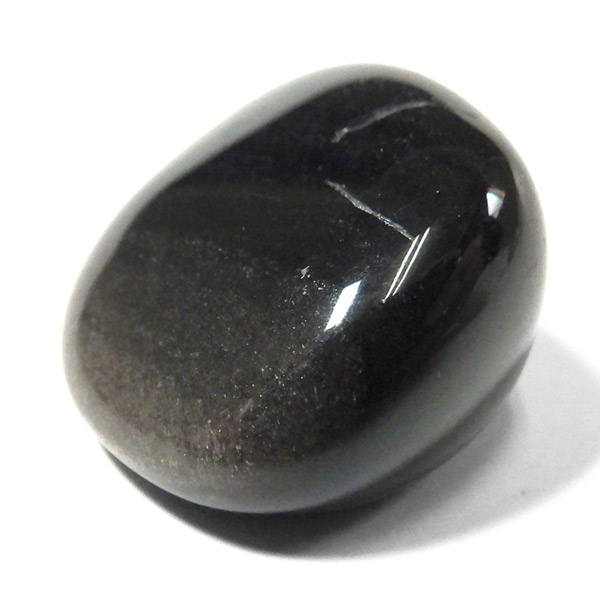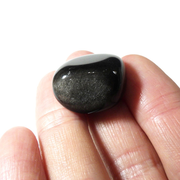 メキシコ産のシルバーオブシディアン、タンブルです。オブシディアンは和名で黒曜石。シルバーオブシディアンは黒曜石の中でもシルバーのシラー光沢を確認できる天然の火山ガラスです。シルバーオブシディアンはマグマが急速に冷却する際にナノ粒子が取り込まれ、その内包物によって引き起こされる光の干渉を持つ黒曜石のことです。角度によって現れるシルバーの輝きがシックでかっこいいです。