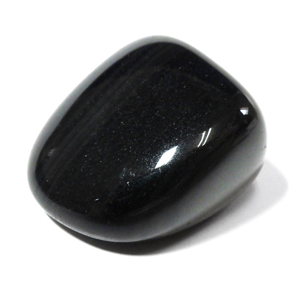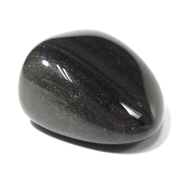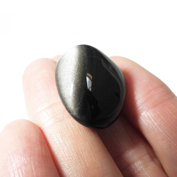 メキシコ産のシルバーオブシディアン、タンブルです。オブシディアンは和名で黒曜石。シルバーオブシディアンは黒曜石の中でもシルバーのシラー光沢を確認できる天然の火山ガラスです。シルバーオブシディアンはマグマが急速に冷却する際にナノ粒子が取り込まれ、その内包物によって引き起こされる光の干渉を持つ黒曜石のことです。角度によって現れるシルバーの輝きがシックでかっこいいです。