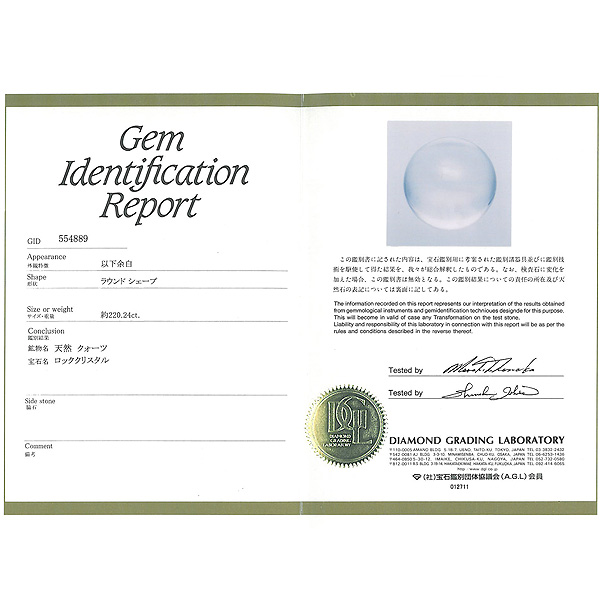 ブラジル産の最高級天然本水晶球を「社団法人 宝石貴金属協会」発行の鑑別書付でお届けします。