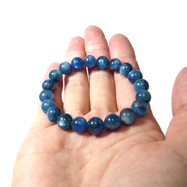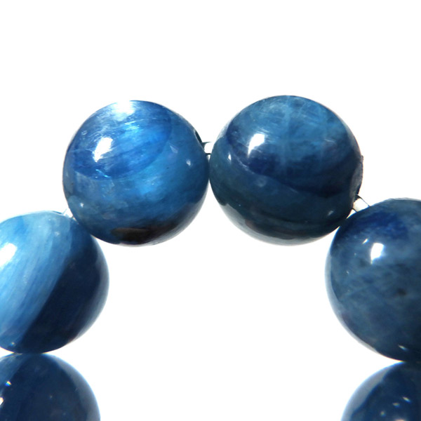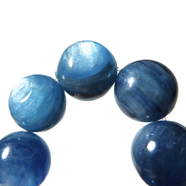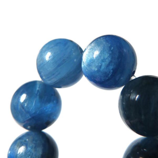 ブラジル産、高品質カイヤナイトのブレスレットです。カイヤナイトの独特のブルーは、サファイアと同じく、含まれる鉄とチタンが要因となっています。 外見だけではブルーサファイアと見間違うこともあります。見た目にも一つの方向に繊維がはっきりと伸びている感じなのですが、カイヤナイトを磨いた玉等はまるで宇宙から見た地球を思わせるような、深く美しいブルーのグラデーションが美しい石です。