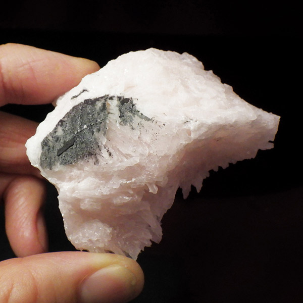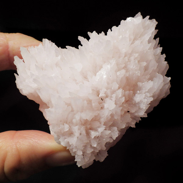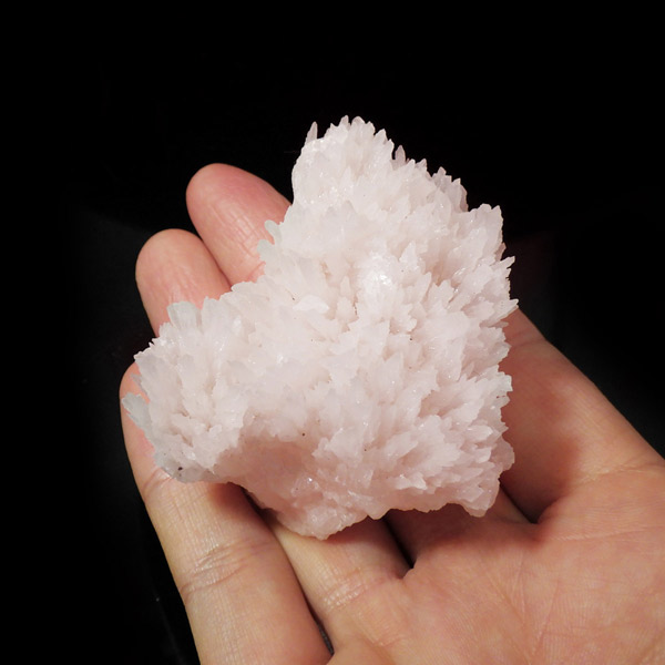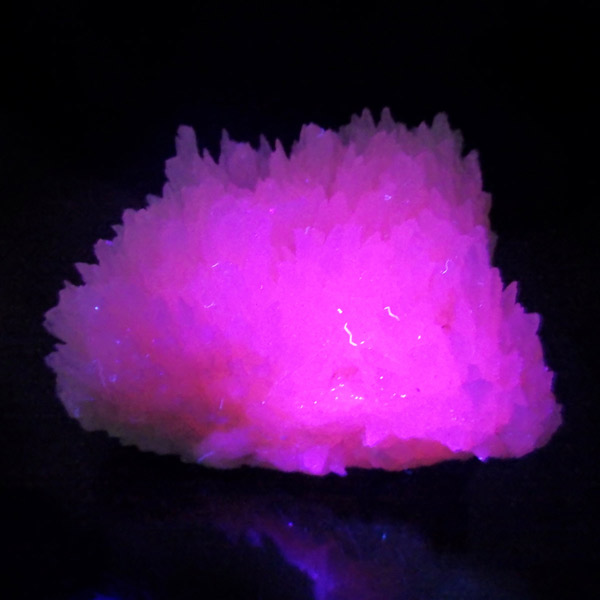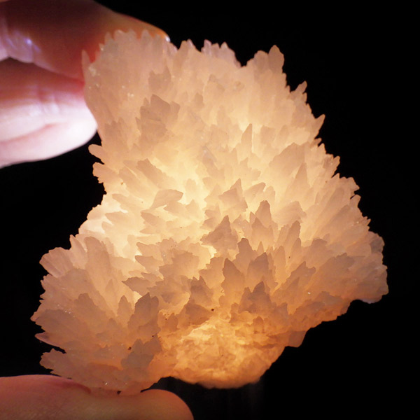 ペルー産ピンクカルサイト原石です。ピンクカルサイトはカルサイトの仲間です。マンガンが入っているので、淡く美しく、優しいピンク色になります。マンガンが含まれることにより、ブラックライトを当てると幻想的なピンク色に発光します。細やかに伸びた結晶が集合した美しい標本です。