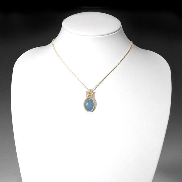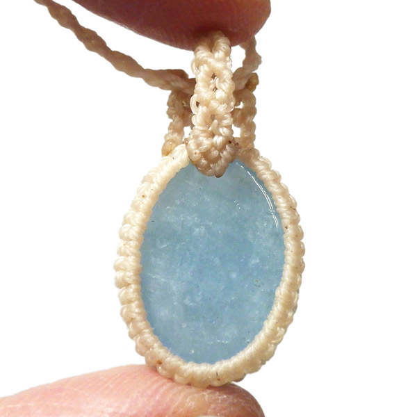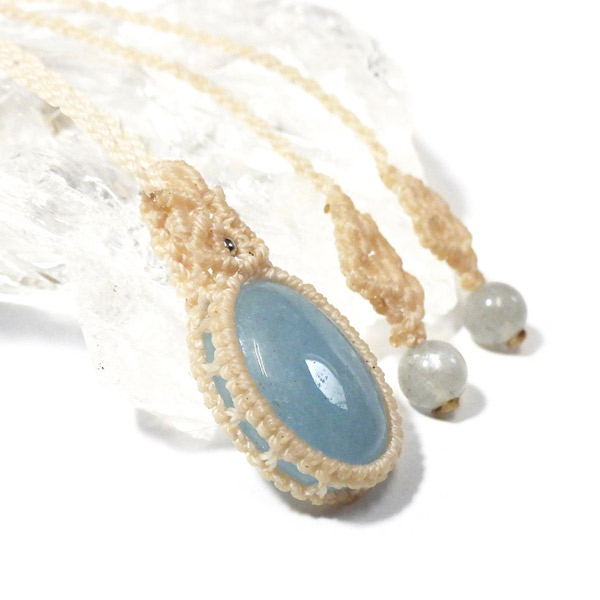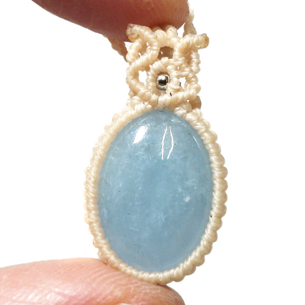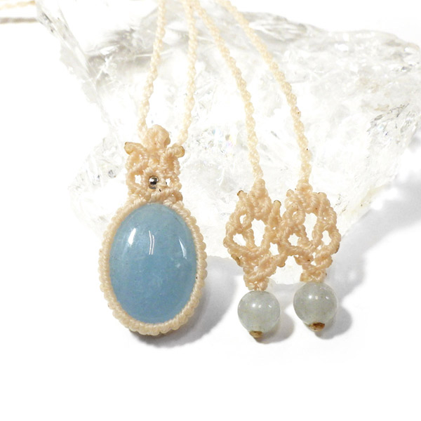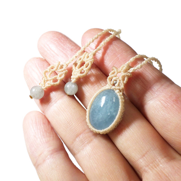 ブラジル産のアクアマリンを使用したマクラメペンダントです。 発色の良いブルーのアクアマリンを使用しました。アクアマリンに合わせて、かわいらしく編みました。