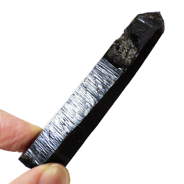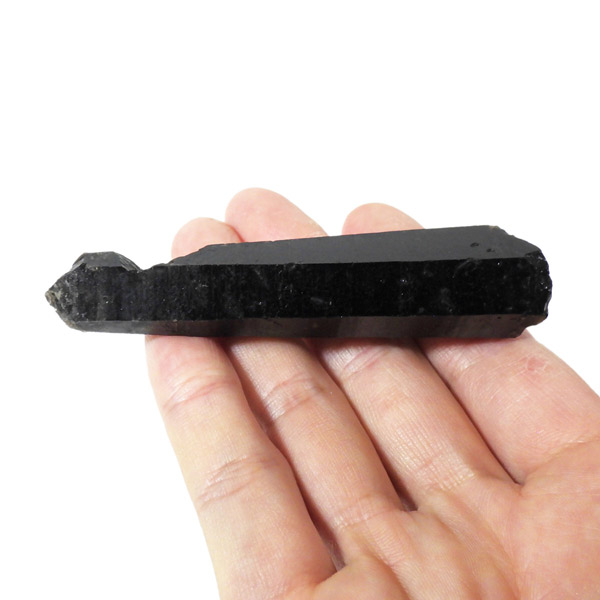 内モンゴル産のモリオン原石ポイントです。 スモーキークォーツの中で、黒色が強く真っ黒な黒水晶をモリオンと呼びます。明確な境界の定義はありませんが、表面が黒光りするものをモリオンと呼んでいます。人によっては光を通すものをケアンゴームと呼ぶ場合もあります。モリオンは水晶の成長過程で微量のアルミニウムが放射性鉱物などの影響を受けると黒色に変色するといわれています。