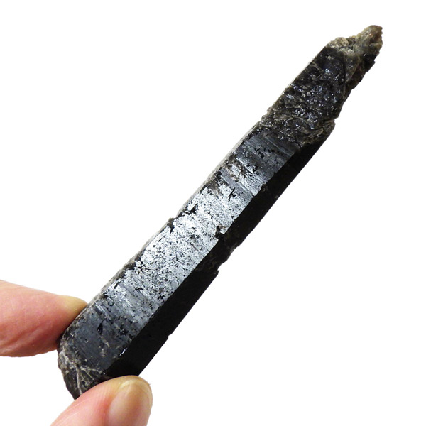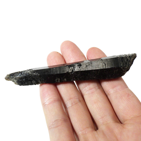 内モンゴル産のモリオン原石ポイントです。 スモーキークォーツの中で、黒色が強く真っ黒な黒水晶をモリオンと呼びます。明確な境界の定義はありませんが、表面が黒光りするものをモリオンと呼んでいます。人によっては光を通すものをケアンゴームと呼ぶ場合もあります。モリオンは水晶の成長過程で微量のアルミニウムが放射性鉱物などの影響を受けると黒色に変色するといわれています。