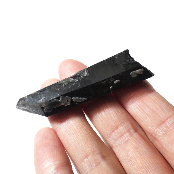 内モンゴル産のモリオン原石ポイントです。 スモーキークォーツの中で、黒色が強く真っ黒な黒水晶をモリオンと呼びます。明確な境界の定義はありませんが、表面が黒光りするものをモリオンと呼んでいます。人によっては光を通すものをケアンゴームと呼ぶ場合もあります。モリオンは水晶の成長過程で微量のアルミニウムが放射性鉱物などの影響を受けると黒色に変色するといわれています。