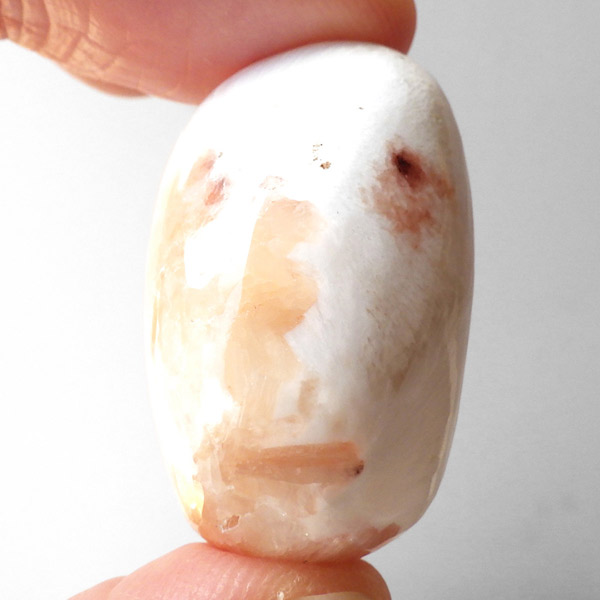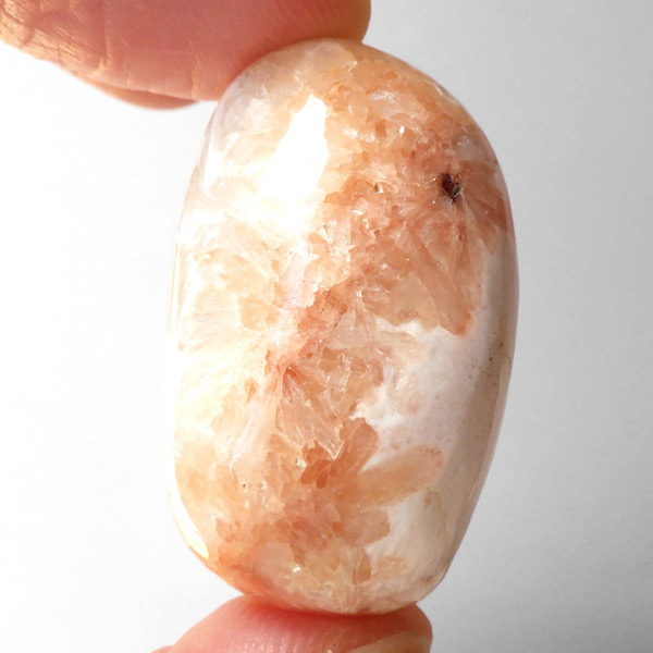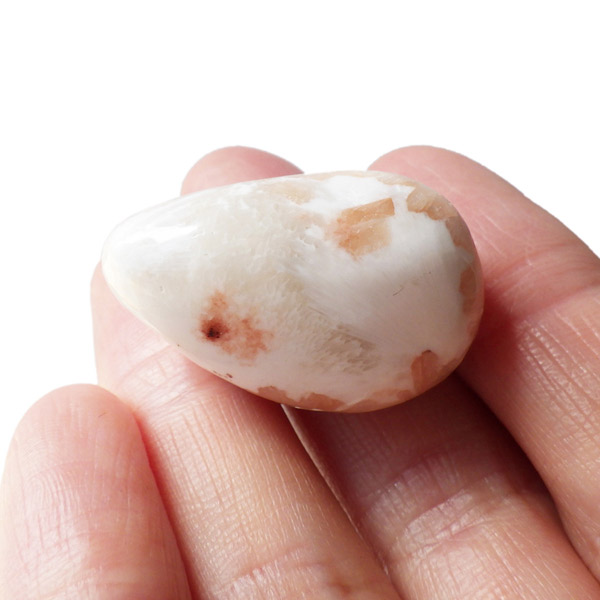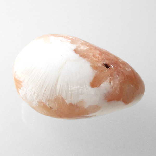 インド産のスティルバイトwithスコレサイト、タンブルです。スティルバイトとスコレサイトのカラーの対比がおもしろいタンブルです。オレンジの束状がスティルバイト、白く細長い繊維状の結晶がスコレサイトです。スティルバイトはナトリウムとカルシウムの含水アルミノケイ酸塩です。この鉱物が示すガラス光沢~真珠光沢にちなんで、ギリシャ語で「輝く」を意味する言葉をとって命名されました。「気高さ」の石言葉を持つスティルバイトは、なめらかなシルクのような美しい光沢が特徴です。スコレサイトは天使の羽みたいな繊維状の白色光沢が美しく、清らかなエネルギーを感じられる石です。直感力などを高めたり、過去の記憶を呼び起こして現在へと導く石と言われており、瞑想などにも適したヒーリングストーンです。