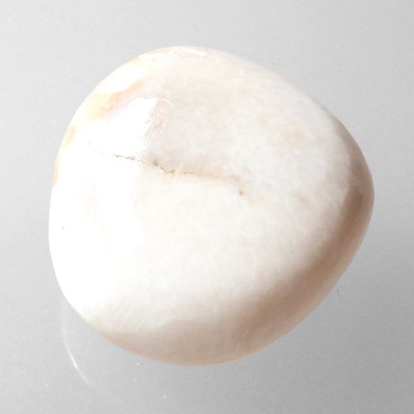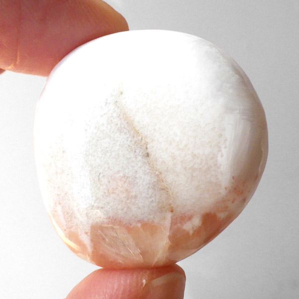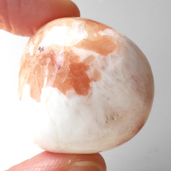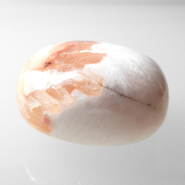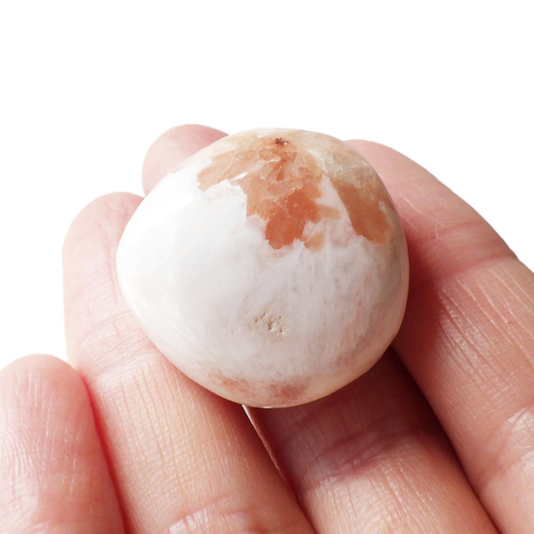 インド産のスティルバイトwithスコレサイト、タンブルです。スティルバイトとスコレサイトのカラーの対比がおもしろいタンブルです。オレンジの束状がスティルバイト、白く細長い繊維状の結晶がスコレサイトです。スティルバイトはナトリウムとカルシウムの含水アルミノケイ酸塩です。この鉱物が示すガラス光沢~真珠光沢にちなんで、ギリシャ語で「輝く」を意味する言葉をとって命名されました。「気高さ」の石言葉を持つスティルバイトは、なめらかなシルクのような美しい光沢が特徴です。スコレサイトは天使の羽みたいな繊維状の白色光沢が美しく、清らかなエネルギーを感じられる石です。直感力などを高めたり、過去の記憶を呼び起こして現在へと導く石と言われており、瞑想などにも適したヒーリングストーンです。