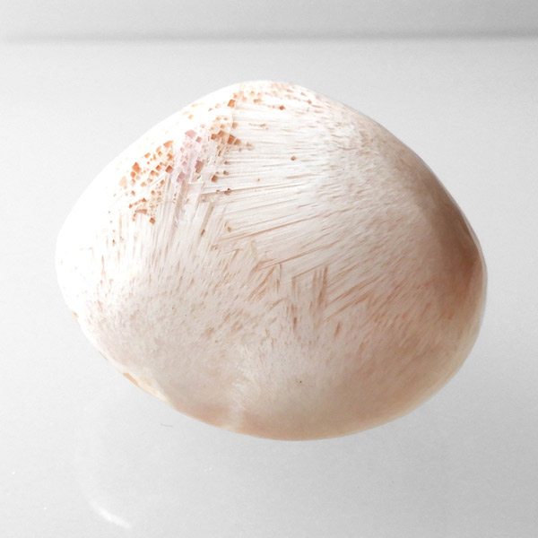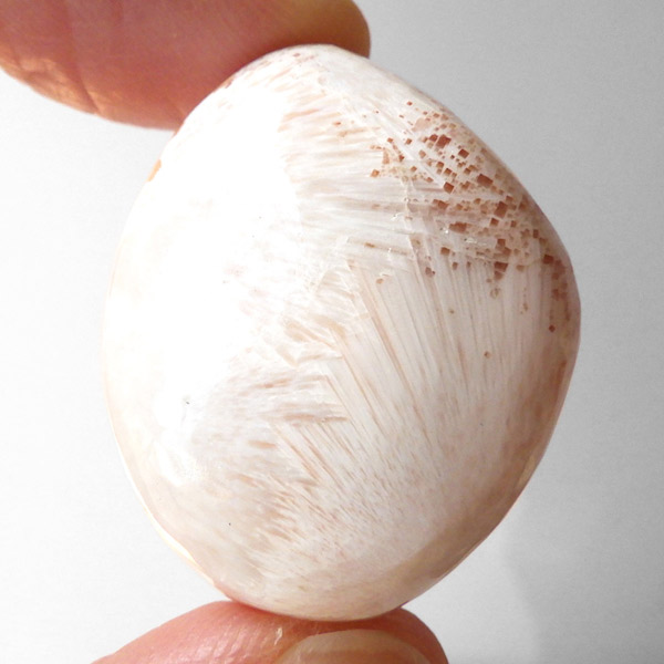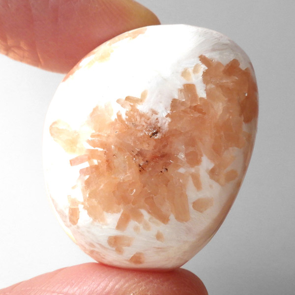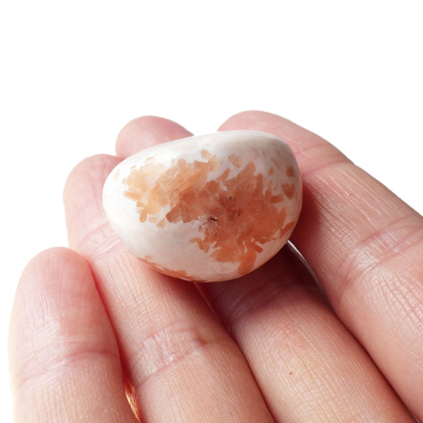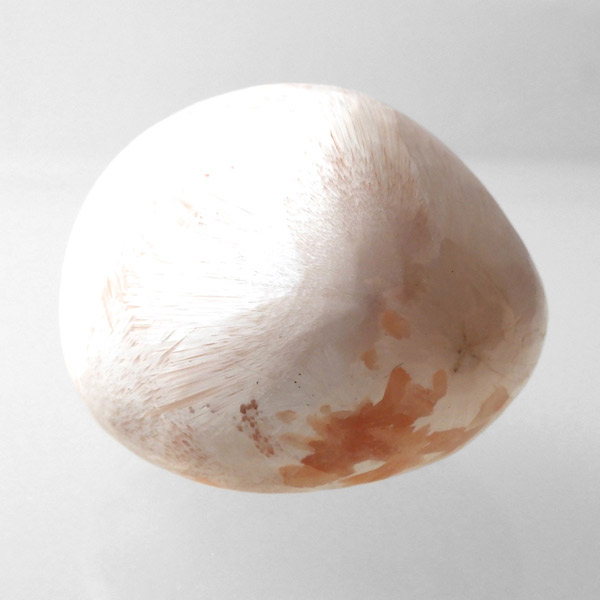 インド産のスティルバイトwithスコレサイト、タンブルです。スティルバイトとスコレサイトのカラーの対比がおもしろいタンブルです。オレンジの束状がスティルバイト、白く細長い繊維状の結晶がスコレサイトです。スティルバイトはナトリウムとカルシウムの含水アルミノケイ酸塩です。この鉱物が示すガラス光沢~真珠光沢にちなんで、ギリシャ語で「輝く」を意味する言葉をとって命名されました。「気高さ」の石言葉を持つスティルバイトは、なめらかなシルクのような美しい光沢が特徴です。スコレサイトは天使の羽みたいな繊維状の白色光沢が美しく、清らかなエネルギーを感じられる石です。直感力などを高めたり、過去の記憶を呼び起こして現在へと導く石と言われており、瞑想などにも適したヒーリングストーンです。