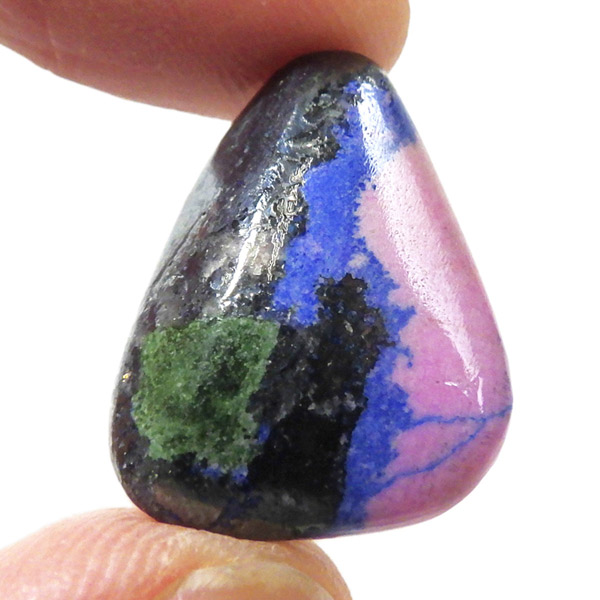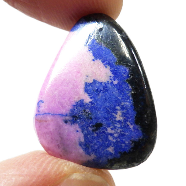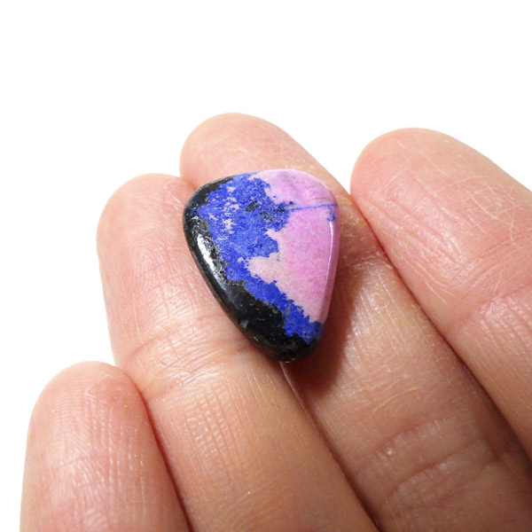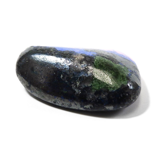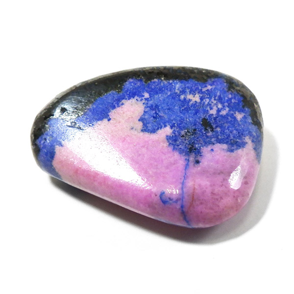 コンゴ共和国産のコバルトカルサイト、タンブルです。コバルトカルサイトと言えば、モロッコが世界的に有名な産地ですが、コンゴ産と言えば比較的 新しい産地で ここ近年注目が高まっている新産地です。 コンゴ産の特徴はコバルト特有なビビットなピンクで、細やかな結晶はキラキラと美しく輝き、母岩を覆い尽くすように結晶しています。更に、コバルト系の鉱物にも関わらず、マラカイト・クリソコラ・パイライト・スクテルド鉱など様々な鉱物が混入するユニークなものです。これはモロッコ産にはまったく見られない特徴で、コンゴ産ならではのものといってよいでしょう。そんな中でも珍しく青いアズライトが共生しているタンブルです。