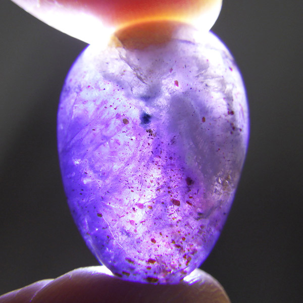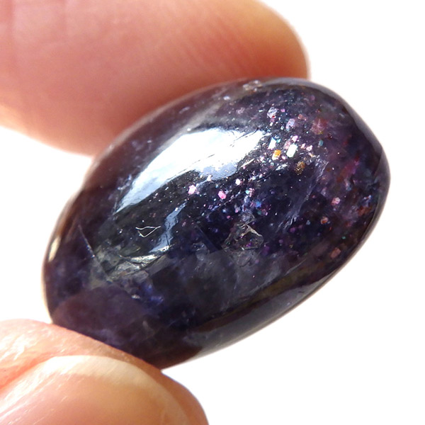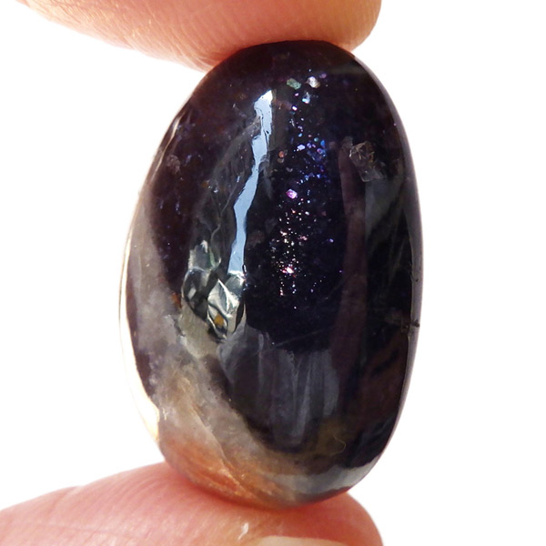 サンストーンの部分はもちろん、アイオライトの部分も内包物が見られ、アベンチュレッセンス効果でキラキラと輝いて見えます。