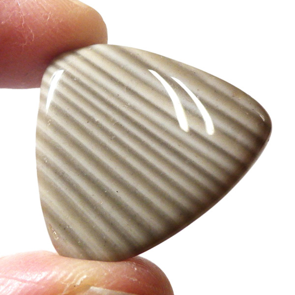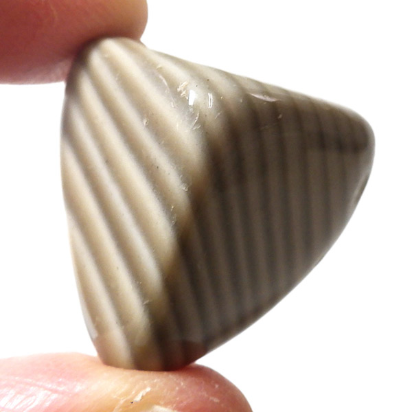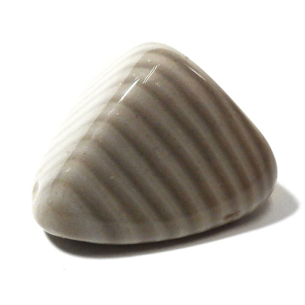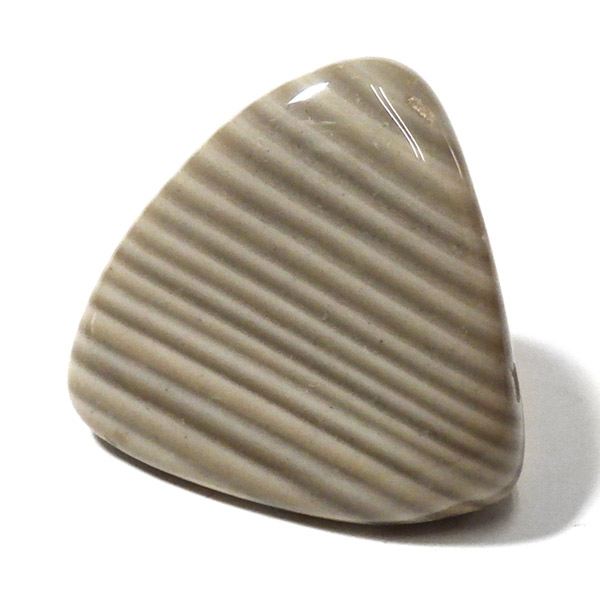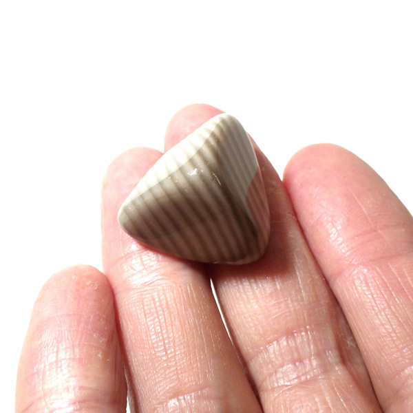 ポーランド産フリント、タンブルです。 一般的にフリントやフリントストーンの名前で流通している石で、縞模様がきれいに出ているものはストライプフリント、バンデッドフリントとも呼ばれています。フリントはケイ素等で構成される堆積岩の一種です。緻密な岩石で非常に硬く、古来より矢じりや火打石として使用されていた石です。各地で産出される石ですが、ポーランド産のフリントは特に縞模様が綺麗でアクセサリーやお守りとしても人気です。