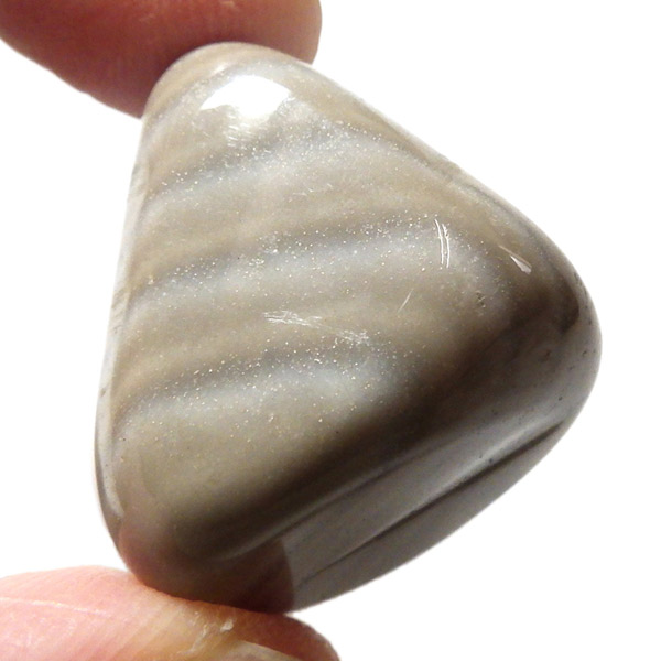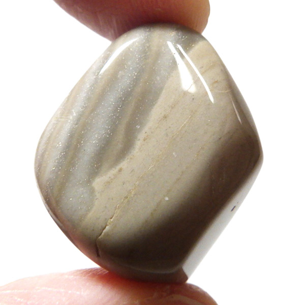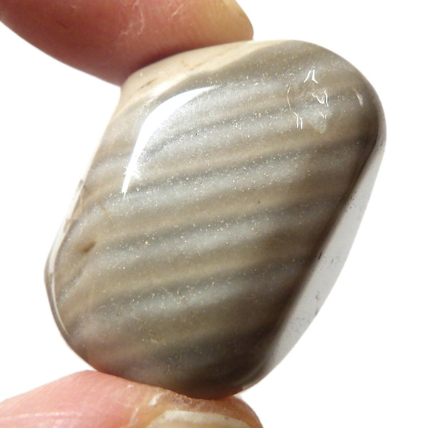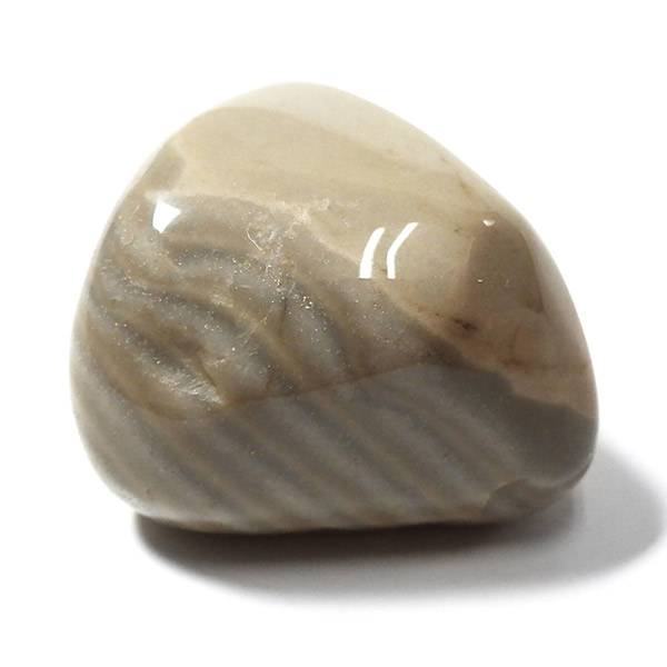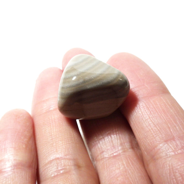 ポーランド産フリント、タンブルです。 一般的にフリントやフリントストーンの名前で流通している石で、縞模様がきれいに出ているものはストライプフリント、バンデッドフリントとも呼ばれています。フリントはケイ素等で構成される堆積岩の一種です。緻密な岩石で非常に硬く、古来より矢じりや火打石として使用されていた石です。各地で産出される石ですが、ポーランド産のフリントは特に縞模様が綺麗でアクセサリーやお守りとしても人気です。