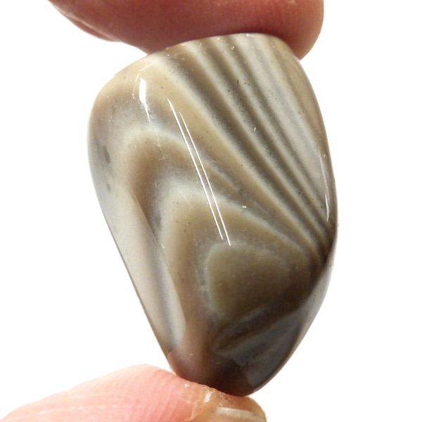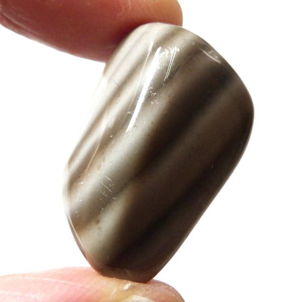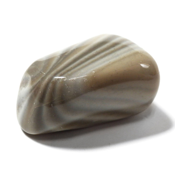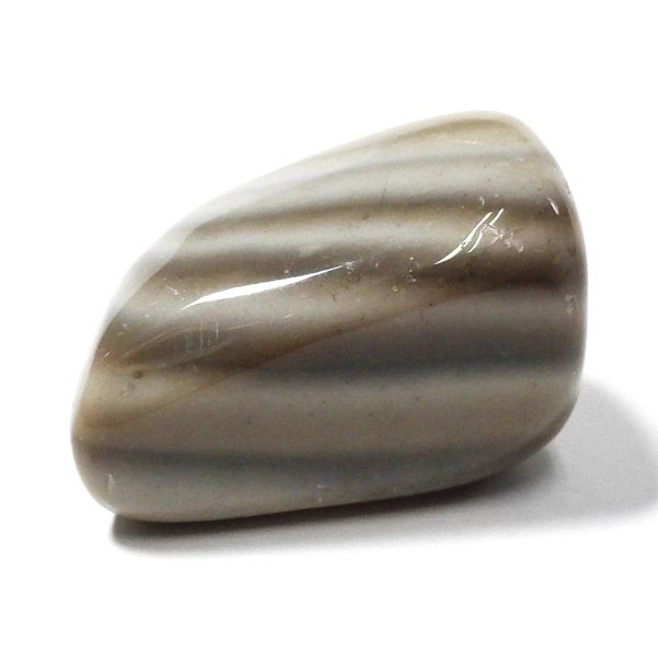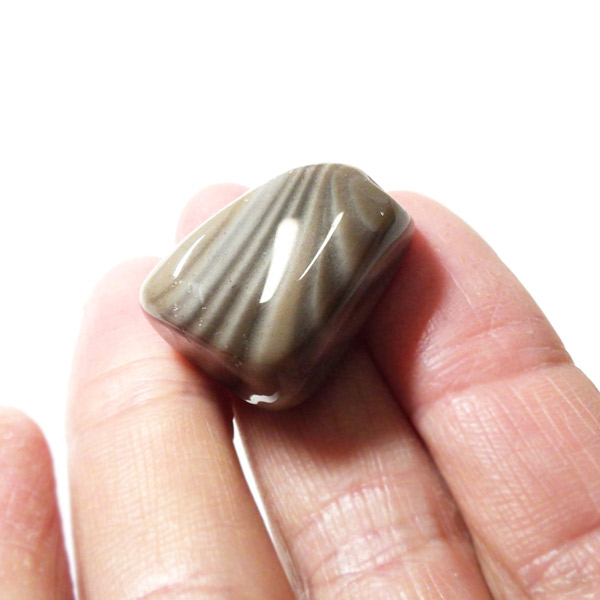 ポーランド産フリント、タンブルです。 一般的にフリントやフリントストーンの名前で流通している石で、縞模様がきれいに出ているものはストライプフリント、バンデッドフリントとも呼ばれています。フリントはケイ素等で構成される堆積岩の一種です。緻密な岩石で非常に硬く、古来より矢じりや火打石として使用されていた石です。各地で産出される石ですが、ポーランド産のフリントは特に縞模様が綺麗でアクセサリーやお守りとしても人気です。
