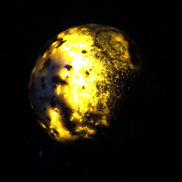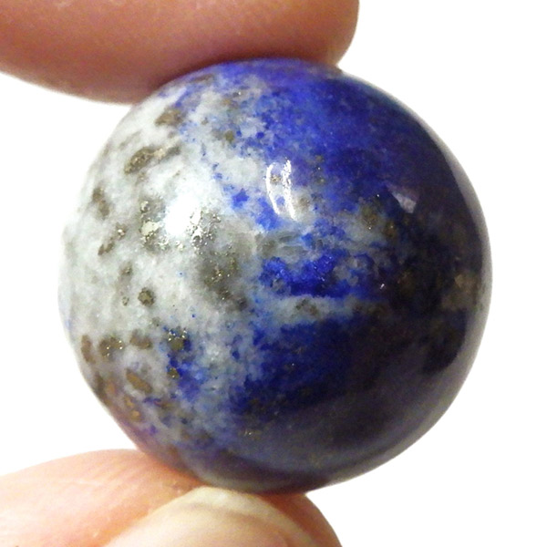 アフガニスタン産のラピスラズリ球です。ラピスラズリは、ラズライト・アウィン・ソーダライト・ノーゼライトが集合したものです。特に、ラズライトとノーゼライトを多く含有すると、深く美しい色彩のラピスラズリとなります。黄金色のパイライト、白色のカルサイトなど"が小さな斑点としてみられます。365nmのブラックライトによる鮮やかな黄色・オレンジの蛍光はソーダライト起因、ピンク系の蛍光はカルサイトによるものと思われます。ラピスラズリは幸福を呼び込む石として人気があります。