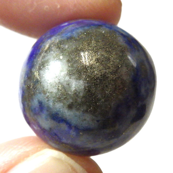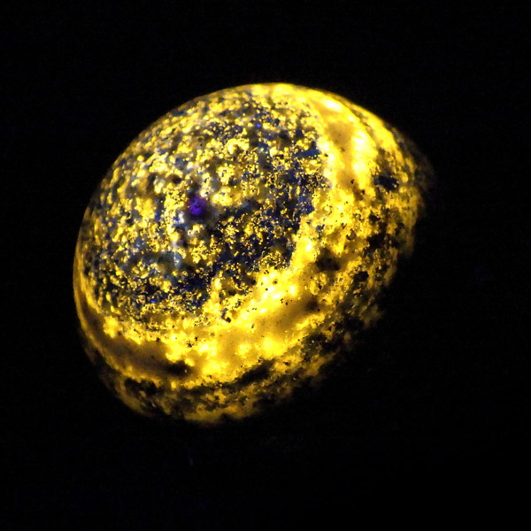 アフガニスタン産のラピスラズリ球です。ラピスラズリは、ラズライト・アウィン・ソーダライト・ノーゼライトが集合したものです。特に、ラズライトとノーゼライトを多く含有すると、深く美しい色彩のラピスラズリとなります。黄金色のパイライト、白色のカルサイトなど"が小さな斑点としてみられます。365nmのブラックライトによる鮮やかな黄色・オレンジの蛍光はソーダライト起因、ピンク系の蛍光はカルサイトによるものと思われます。ラピスラズリは幸福を呼び込む石として人気があります。