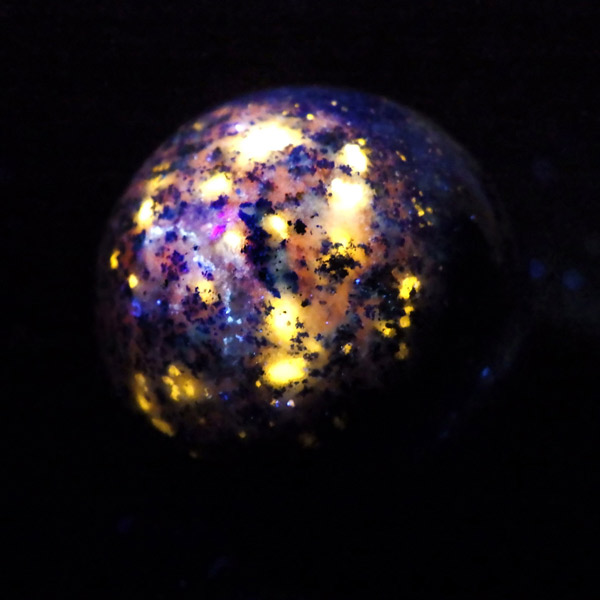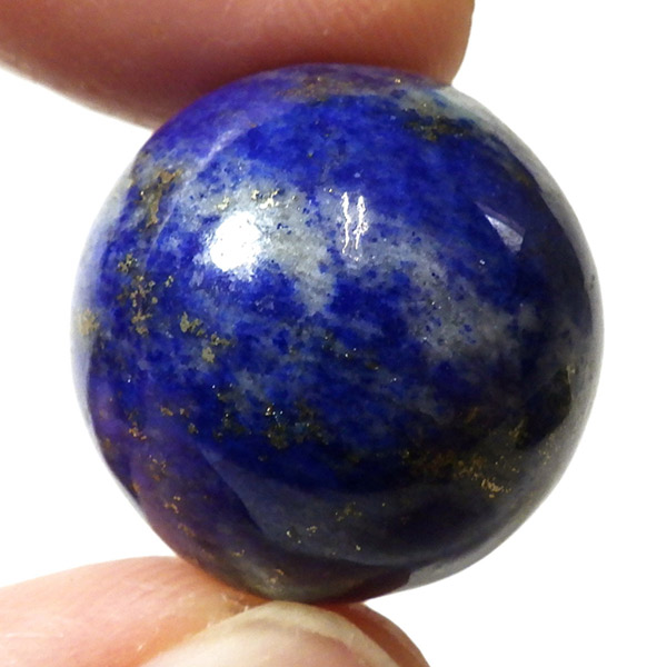 アフガニスタン産のラピスラズリ球です。ラピスラズリは、ラズライト・アウィン・ソーダライト・ノーゼライトが集合したものです。特に、ラズライトとノーゼライトを多く含有すると、深く美しい色彩のラピスラズリとなります。黄金色のパイライト、白色のカルサイトなど"が小さな斑点としてみられます。365nmのブラックライトによる鮮やかな黄色・オレンジの蛍光はソーダライト起因、ピンク系の蛍光はカルサイトによるものと思われます。ラピスラズリは幸福を呼び込む石として人気があります。
