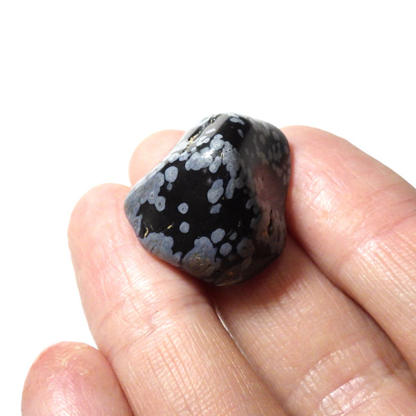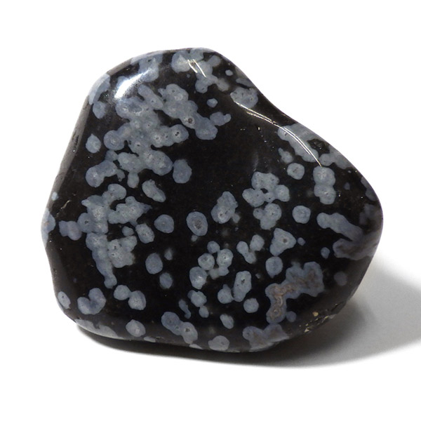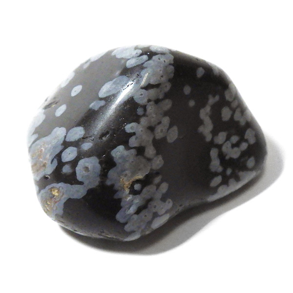 アメリカ・ユタ州産のスノーフレークオブシディアン、タンブルです。オブシディアンは、火山性の天然ガラスです。その中にクリストバライトと言う火山性鉱物が入り込んで、白い斑点模様を織り成しているのです。表面に雪の結晶のような模様が見えるのが特徴です。