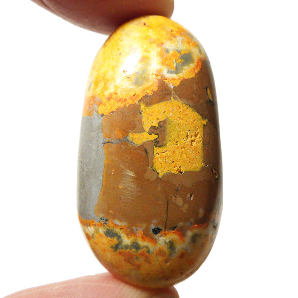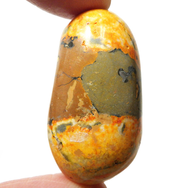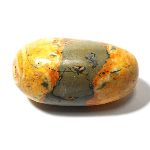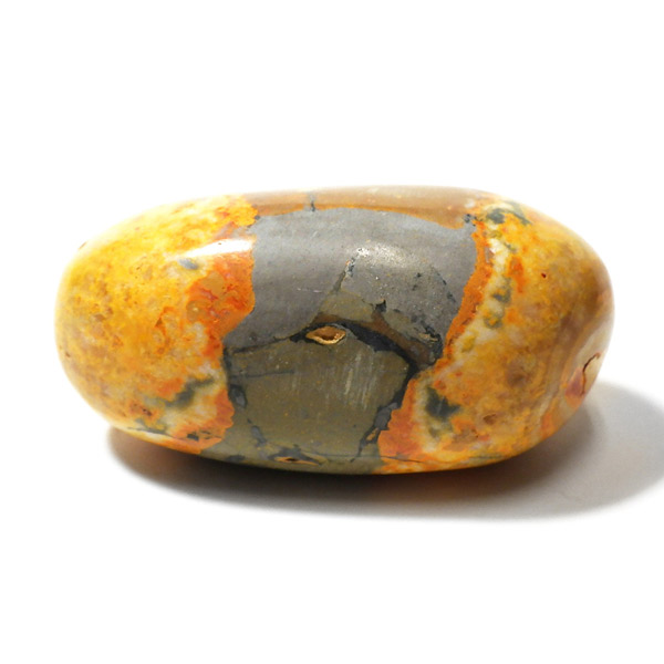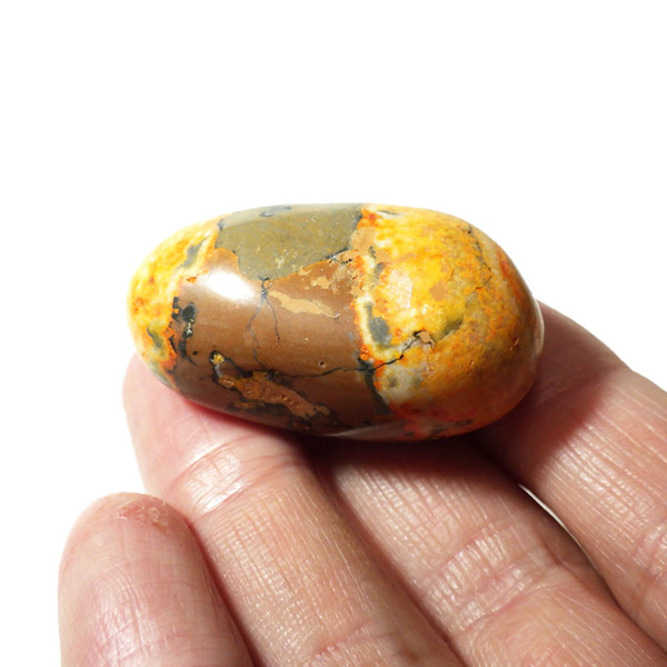 インドネシア産のバンブルビージャスパー、タンブルです。発色とグラデーションが美しいものを選りすぐりました。バンブルビージャスパー、別名エクリプスとも呼ばれます。「バンブルビー」とは、ミツバチの一種のマルハナバチのことで、黒地にイエローの模様からこの名前がつけられました。また、「エクリプス」とは、皆既日食を意味しています。バンブルビージャスパーは特徴的な黄色、オレンジ、黒の縞模様を持つ繊維状方解石でできています。主に硫黄がビビッドな発色を生み出すと言われ、黒い模様は黄鉄鉱によって生じているとされています。
