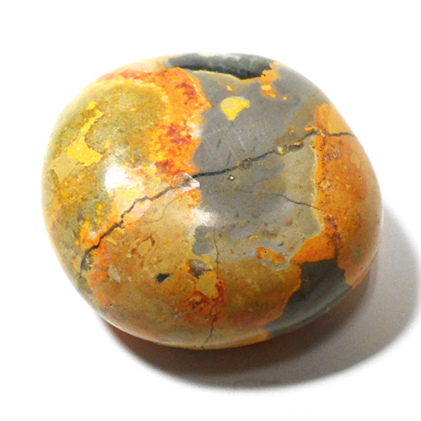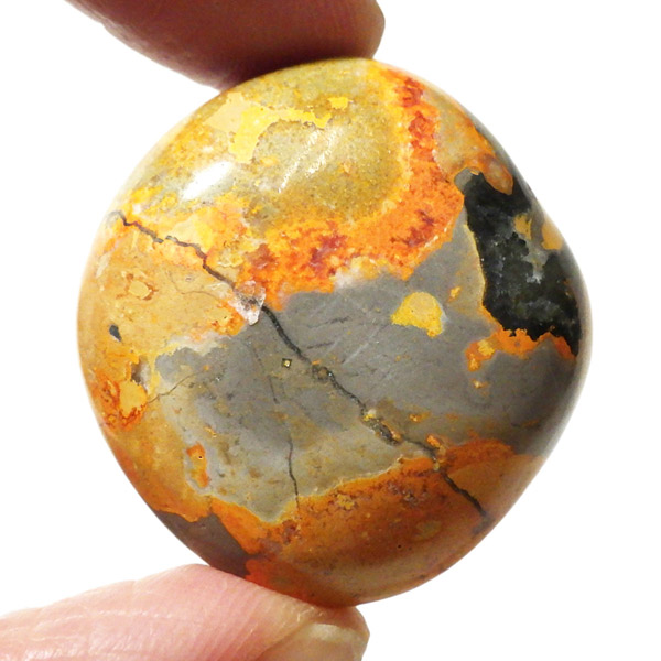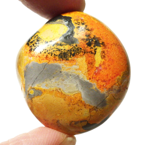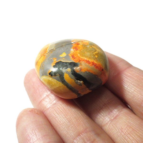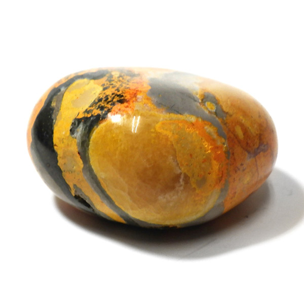 インドネシア産のバンブルビージャスパー、タンブルです。発色とグラデーションが美しいものを選りすぐりました。バンブルビージャスパー、別名エクリプスとも呼ばれます。「バンブルビー」とは、ミツバチの一種のマルハナバチのことで、黒地にイエローの模様からこの名前がつけられました。また、「エクリプス」とは、皆既日食を意味しています。バンブルビージャスパーは特徴的な黄色、オレンジ、黒の縞模様を持つ繊維状方解石でできています。主に硫黄がビビッドな発色を生み出すと言われ、黒い模様は黄鉄鉱によって生じているとされています。