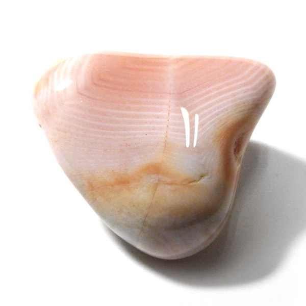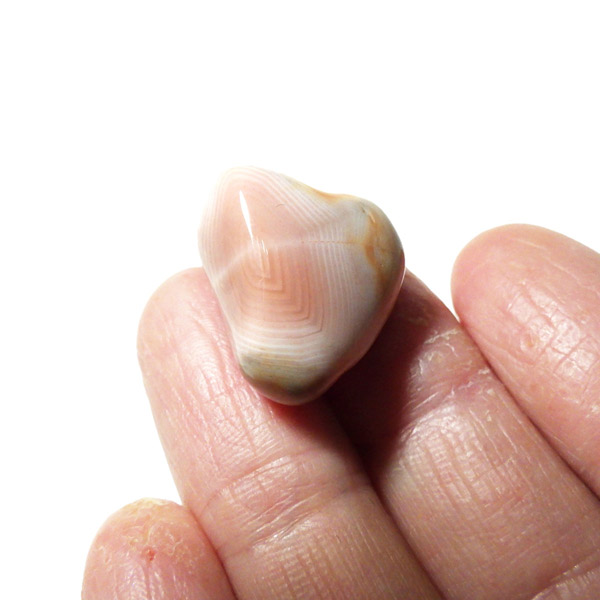 ボツワナ共和国産のピンクボツワナアゲート、タンブルです。アフリカのボツワナ共和国で産出するアゲートをボツワナアゲートと呼びます。 産出するアゲートの色はアイボリー・ベージュ・ブラウン・オレンジ・ピンクなど多色です。その中でもピンクのアゲートはファンが多いのですが、流通は大変少ないです。模様と優しい色味がなんとも可愛らしいタンブルです。