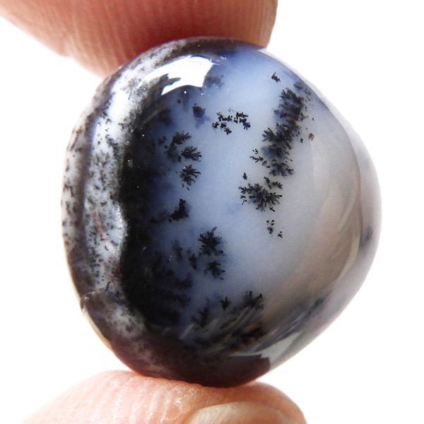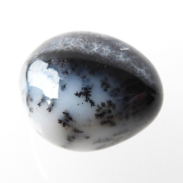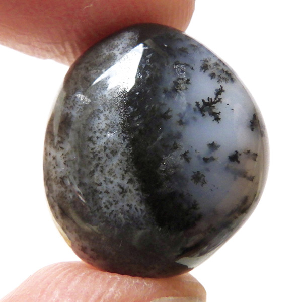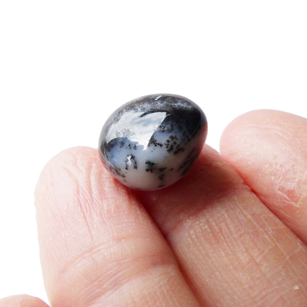 トルコ産のデンドリティックアゲート、タンブルです。デンドリティックアゲートはアゲートまたはクォーツ、オパール内に樹枝状のインクルージョンが見られるもののことです。主に白と黒の混ざった模様が特徴的でまとめてデンドライトとも呼ばれます。酸化マンガンや酸化鉄が割れ目に侵入して模様ができたとされています。模様を付けたように見えますが、これが自然に生成されているので神秘的です。伝説的な魔法使いマーリンにちなんで「メルリナイト/マーリナイト」という名前でも呼ばれています。