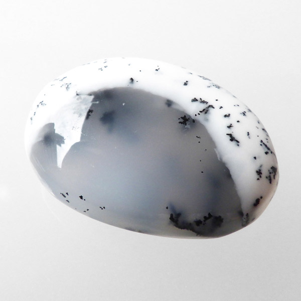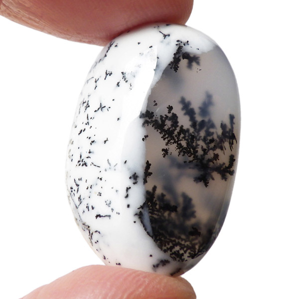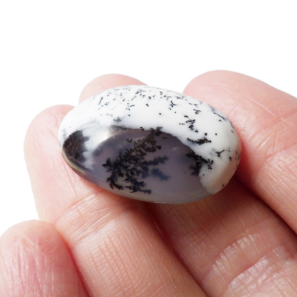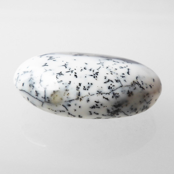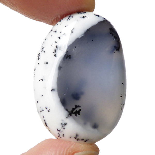 トルコ産のデンドリティックアゲート、タンブルです。デンドリティックアゲートはアゲートまたはクォーツ、オパール内に樹枝状のインクルージョンが見られるもののことです。主に白と黒の混ざった模様が特徴的でまとめてデンドライトとも呼ばれます。酸化マンガンや酸化鉄が割れ目に侵入して模様ができたとされています。模様を付けたように見えますが、これが自然に生成されているので神秘的です。伝説的な魔法使いマーリンにちなんで「メルリナイト/マーリナイト」という名前でも呼ばれています。