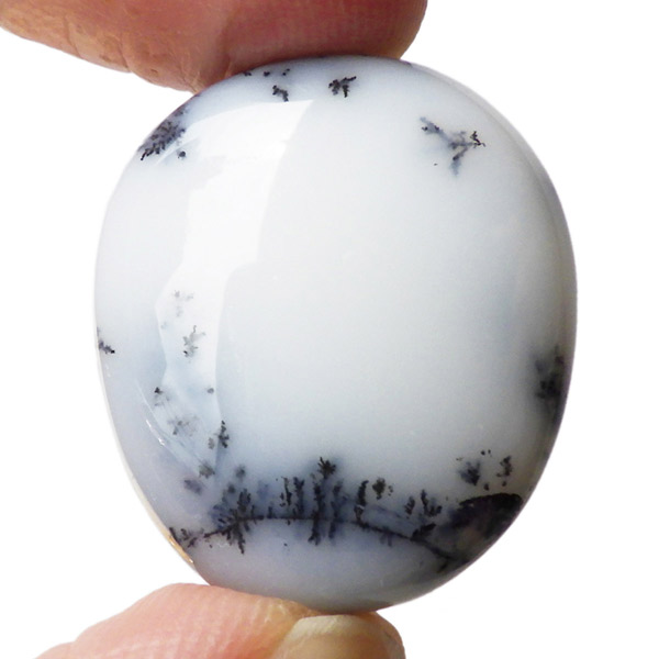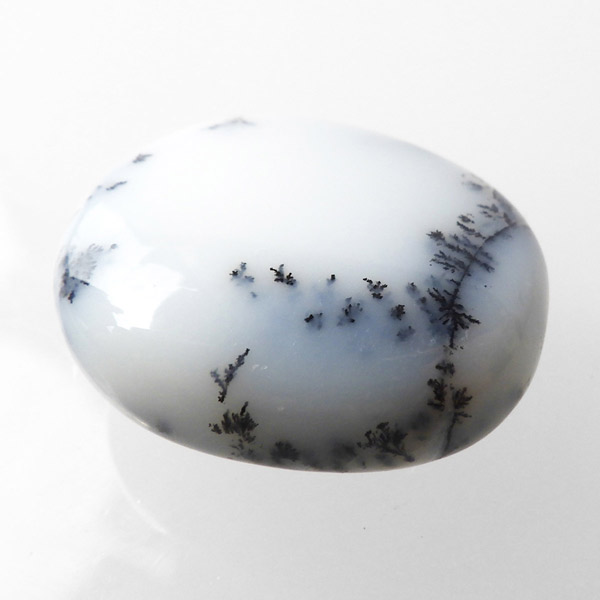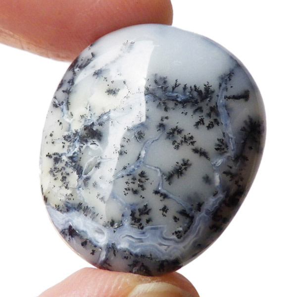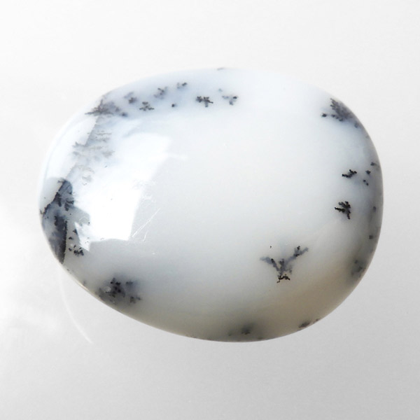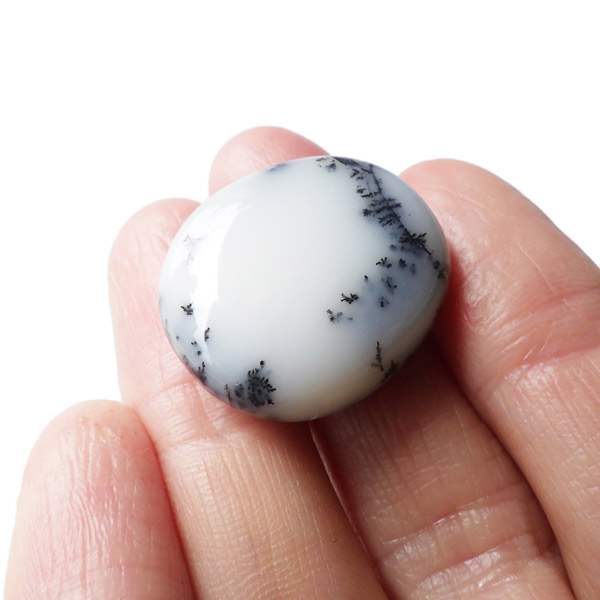 トルコ産のデンドリティックアゲート、タンブルです。デンドリティックアゲートはアゲートまたはクォーツ、オパール内に樹枝状のインクルージョンが見られるもののことです。主に白と黒の混ざった模様が特徴的でまとめてデンドライトとも呼ばれます。酸化マンガンや酸化鉄が割れ目に侵入して模様ができたとされています。模様を付けたように見えますが、これが自然に生成されているので神秘的です。伝説的な魔法使いマーリンにちなんで「メルリナイト/マーリナイト」という名前でも呼ばれています。