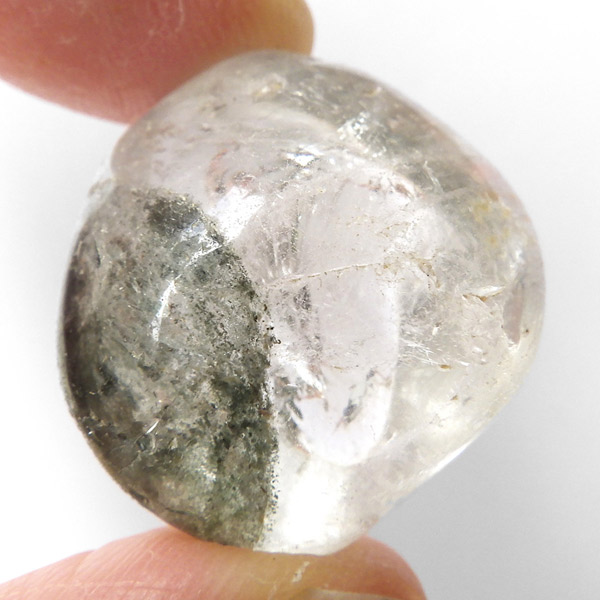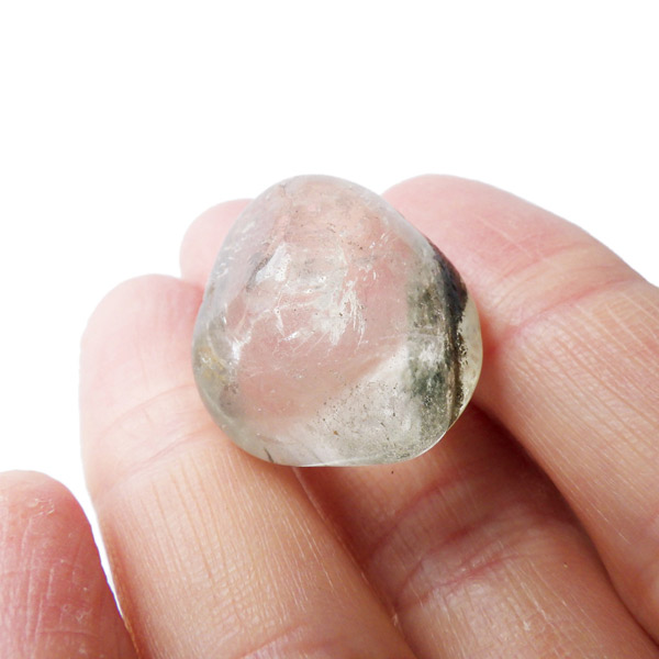 ブラジル産グリーン主体のガーデンクォーツ、タンブルです。ガーデンクォーツは、水晶が形成される過程で、緑や茶色の鉱物や泥岩を巻き込みながら結晶した水晶です。水晶の中に自然の風景が閉じ込められたようにも見えるため、「庭園水晶」「苔入り水晶」とも呼ばれています。 ファントムクォーツは、ガーデンクォーツの一種で、水晶が成長していく過程で、水晶の成長が一時的に停止した際に、その表面に別の鉱物などが付着し、また水晶が再び成長を始めると結晶の中に斜めや三角、山型の模様ができます。