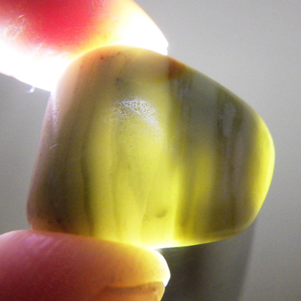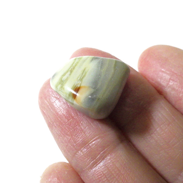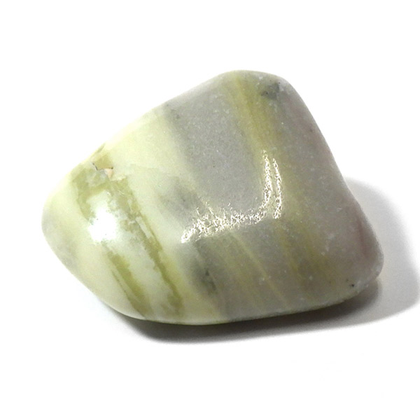 インド産のインフィナイト、タンブルです。インフィナイトはケイ酸マグネシウム鉱物で、クリソタイルとサーペンティンの組み合わせといわれています。通常、黄色、クリーム、緑、などの優しい色味をしており、縞模様が特徴的です。サーペンティンの一種で南アフリカで見つかるものを特別視し、インフィナイトと名づけられました。現在、インフィナイトは南アフリカとインドでしか見られない組み合わせとのことです。インフィナイトストーン、インフィナイトサーペンティンとも呼ばれています。