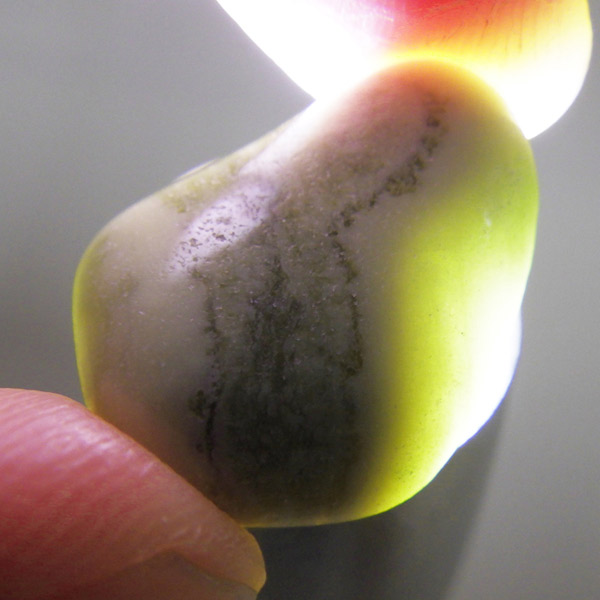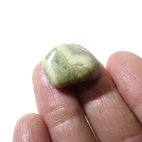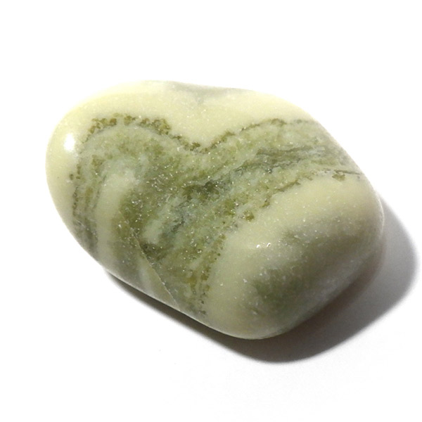 インド産のインフィナイト、タンブルです。インフィナイトはケイ酸マグネシウム鉱物で、クリソタイルとサーペンティンの組み合わせといわれています。通常、黄色、クリーム、緑、などの優しい色味をしており、縞模様が特徴的です。サーペンティンの一種で南アフリカで見つかるものを特別視し、インフィナイトと名づけられました。現在、インフィナイトは南アフリカとインドでしか見られない組み合わせとのことです。インフィナイトストーン、インフィナイトサーペンティンとも呼ばれています。