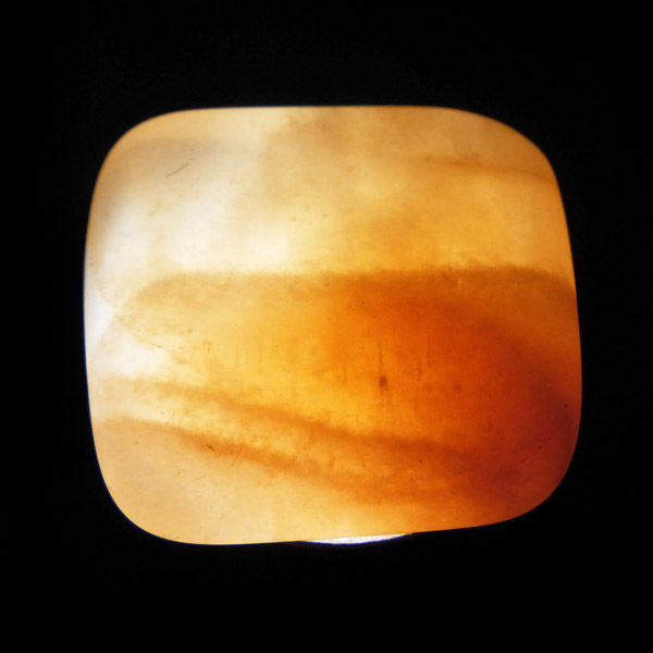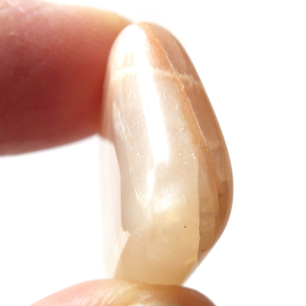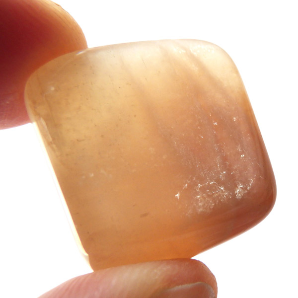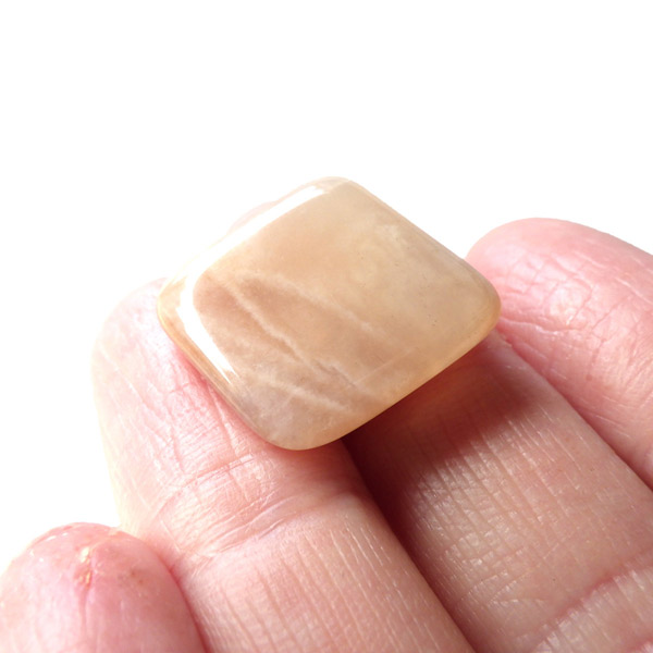 インド産のオレンジムーンストーンです。ムーンストーンは長石(フェルドスパー)という鉱物グループの一種で、和名を月長石といいます。石の内部にある層が光を乱反射して出現する真珠のような柔らかい光の効果を「シラー効果」と呼び、ムーンストーンに見られる特徴です。その光の色は青白いものから、ピンク、オレンジ、白、グレーなど様々です。