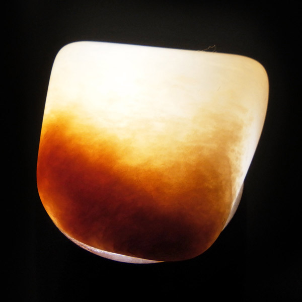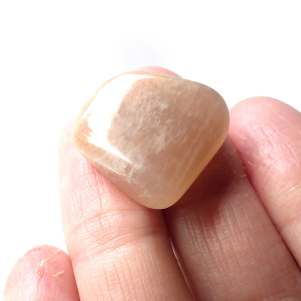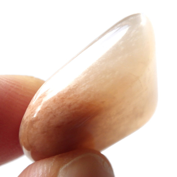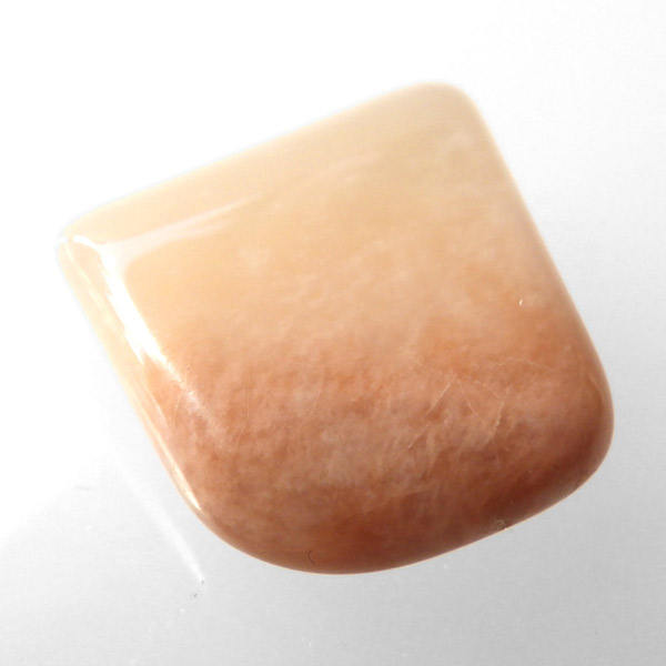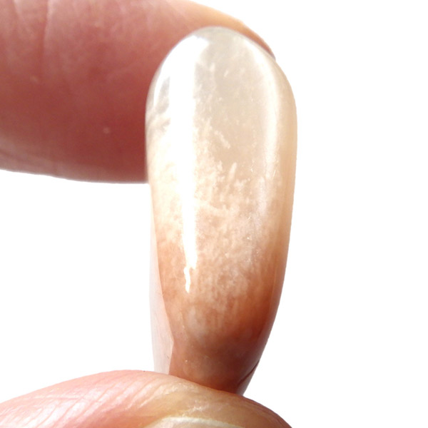インド産のオレンジムーンストーンです。ムーンストーンは長石(フェルドスパー)という鉱物グループの一種で、和名を月長石といいます。石の内部にある層が光を乱反射して出現する真珠のような柔らかい光の効果を「シラー効果」と呼び、ムーンストーンに見られる特徴です。その光の色は青白いものから、ピンク、オレンジ、白、グレーなど様々です。