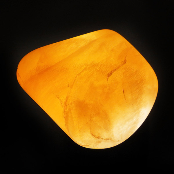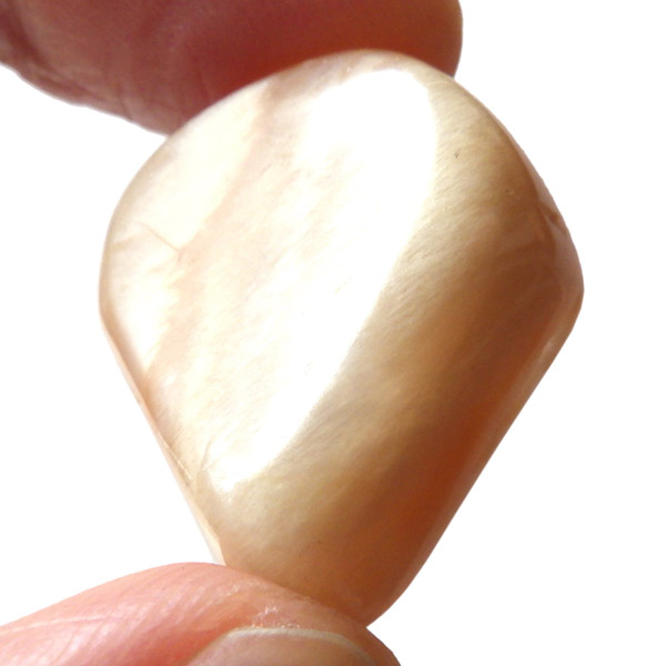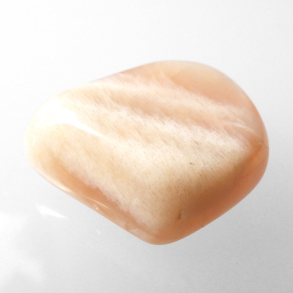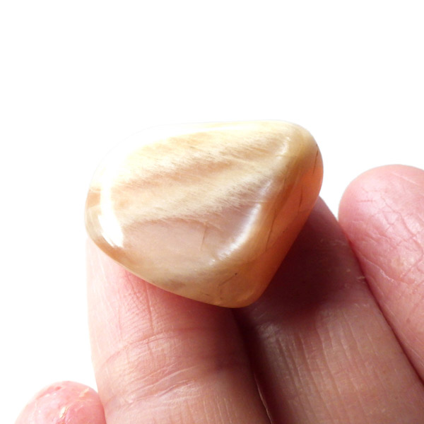 インド産のオレンジムーンストーンです。ムーンストーンは長石(フェルドスパー)という鉱物グループの一種で、和名を月長石といいます。石の内部にある層が光を乱反射して出現する真珠のような柔らかい光の効果を「シラー効果」と呼び、ムーンストーンに見られる特徴です。その光の色は青白いものから、ピンク、オレンジ、白、グレーなど様々です。