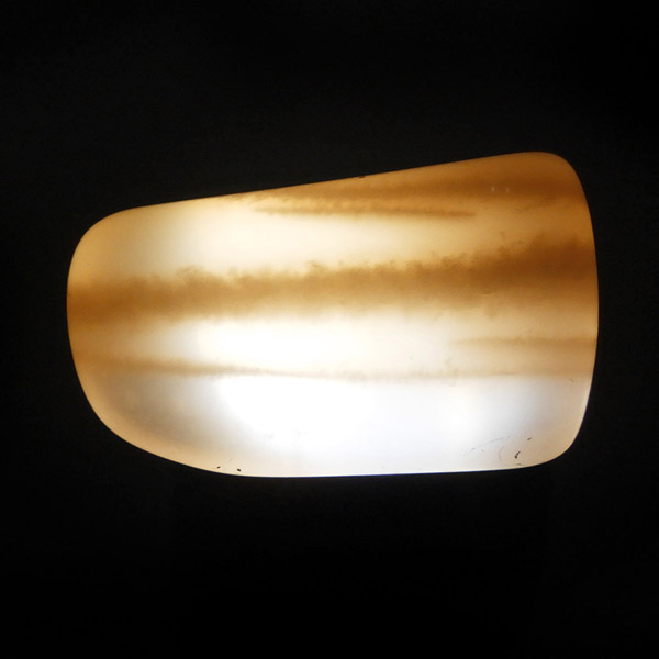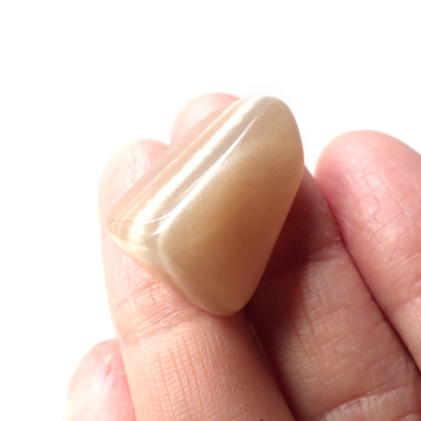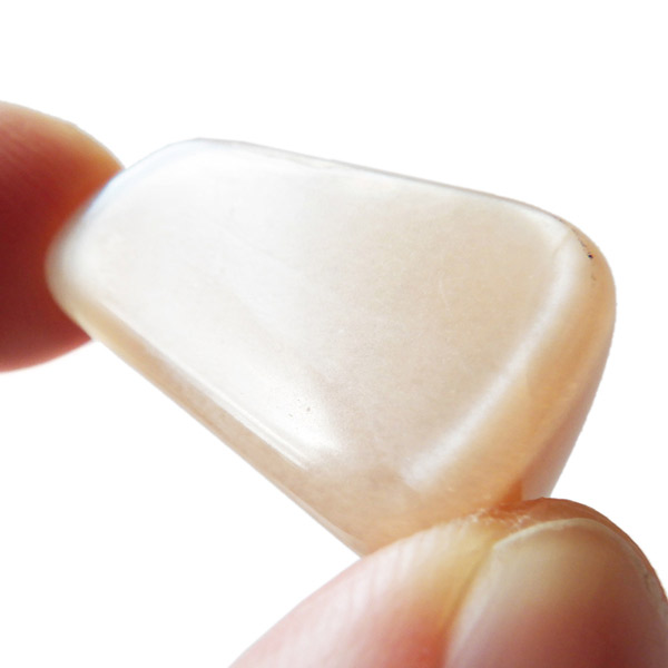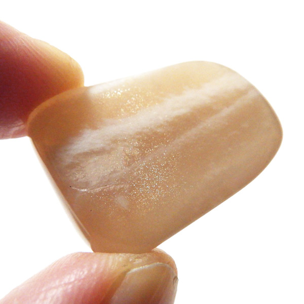 インド産のオレンジムーンストーンです。ムーンストーンは長石(フェルドスパー)という鉱物グループの一種で、和名を月長石といいます。石の内部にある層が光を乱反射して出現する真珠のような柔らかい光の効果を「シラー効果」と呼び、ムーンストーンに見られる特徴です。その光の色は青白いものから、ピンク、オレンジ、白、グレーなど様々です。