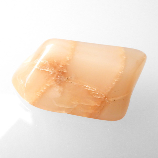 インド産のオレンジムーンストーンです。ムーンストーンは長石(フェルドスパー)という鉱物グループの一種で、和名を月長石といいます。石の内部にある層が光を乱反射して出現する真珠のような柔らかい光の効果を「シラー効果」と呼び、ムーンストーンに見られる特徴です。その光の色は青白いものから、ピンク、オレンジ、白、グレーなど様々です。